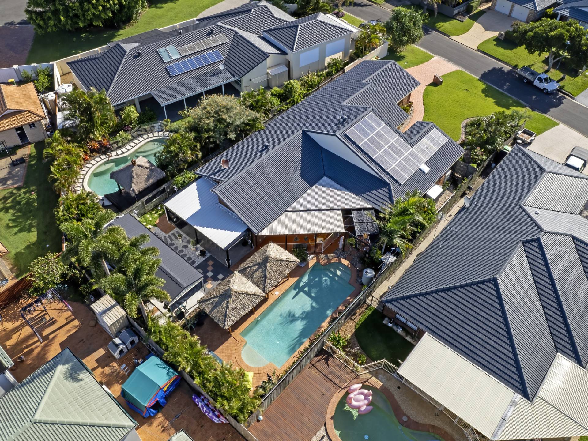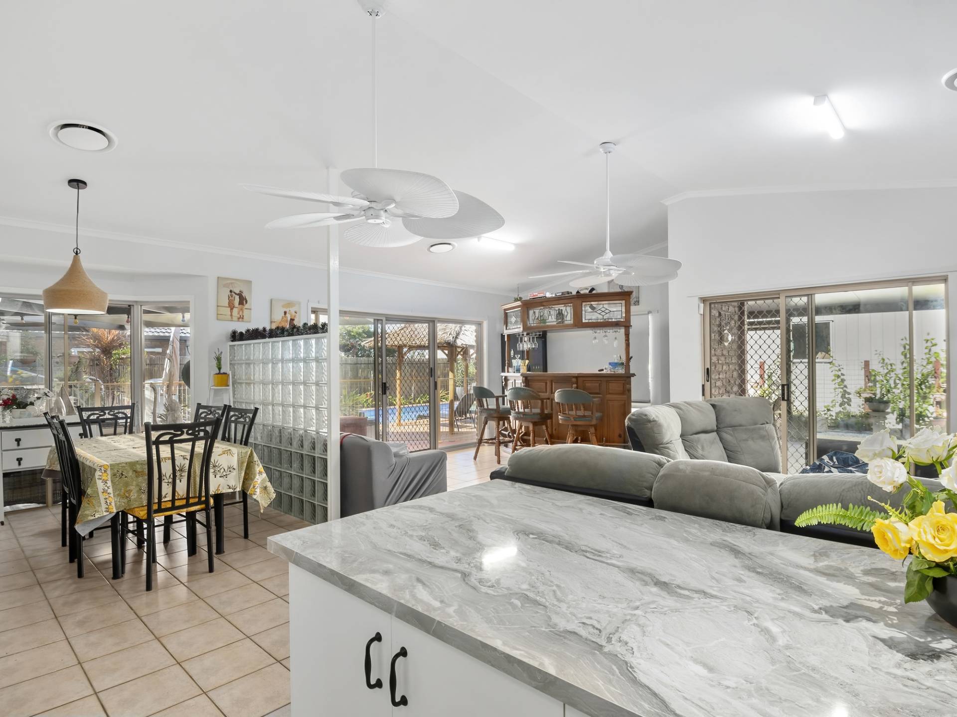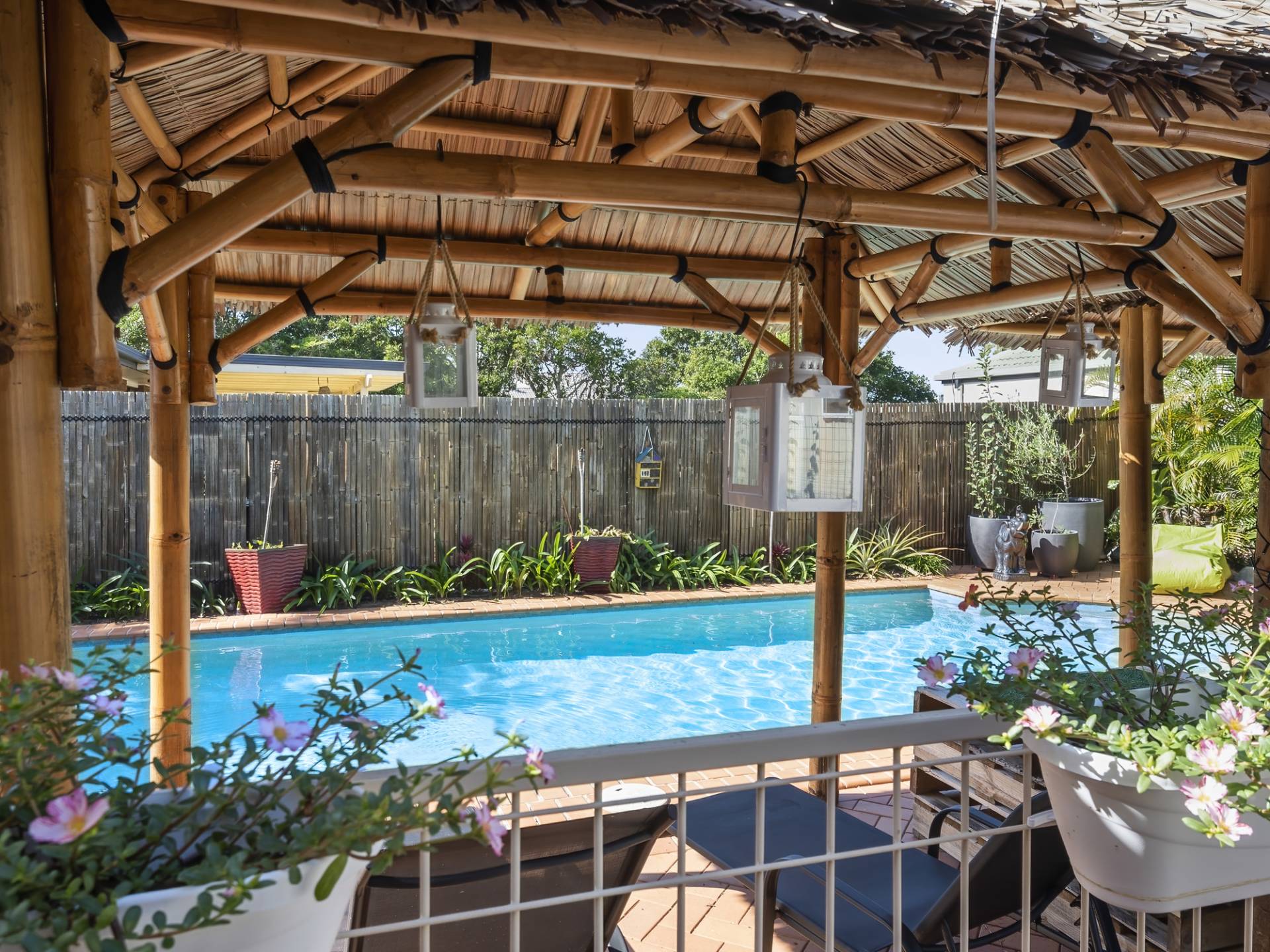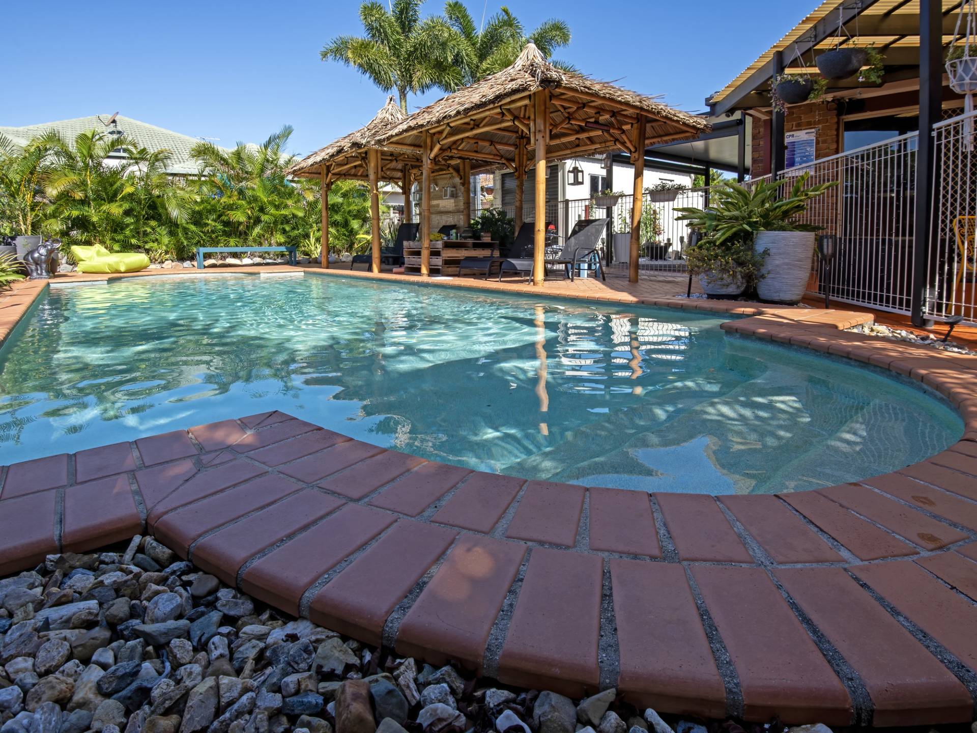 Two separate living areas include a cozy sunken lounge room and a large open plan kitchen, dining and living area. This room is spacious and has high ceilings and tiled floors. The centrally located kitchen is well equipped and has plenty of cupboard and bench space. Adjacent is the dining and living rooms that both lead out to your choice of two undercover entertaining areas. Both overlook the large in-ground swimming pool with Bali Huts and ample room for sunlounges.