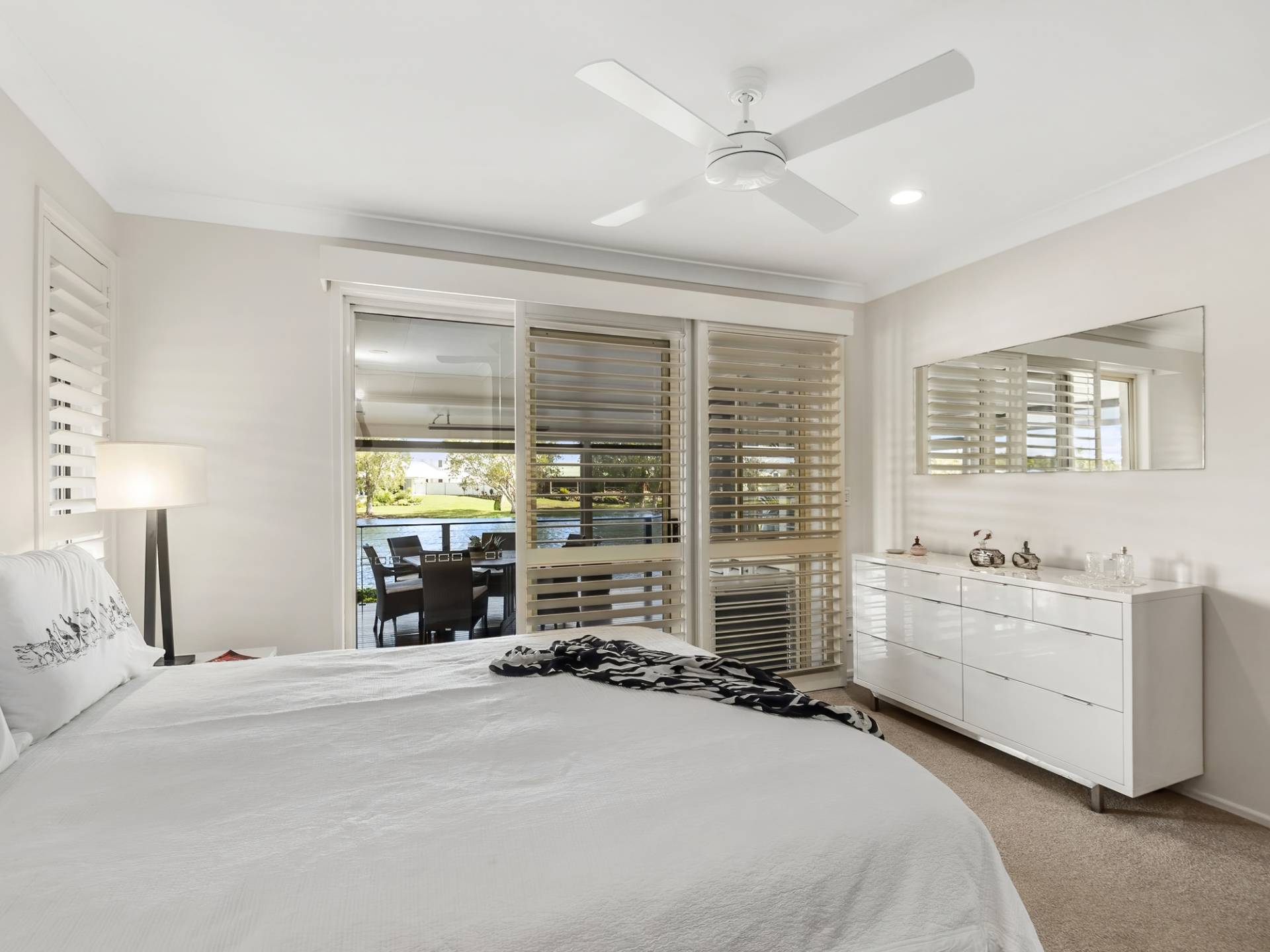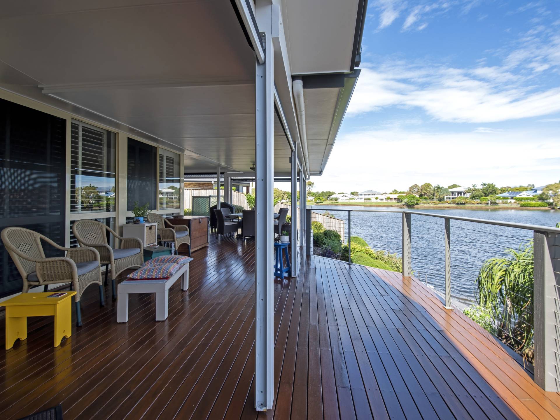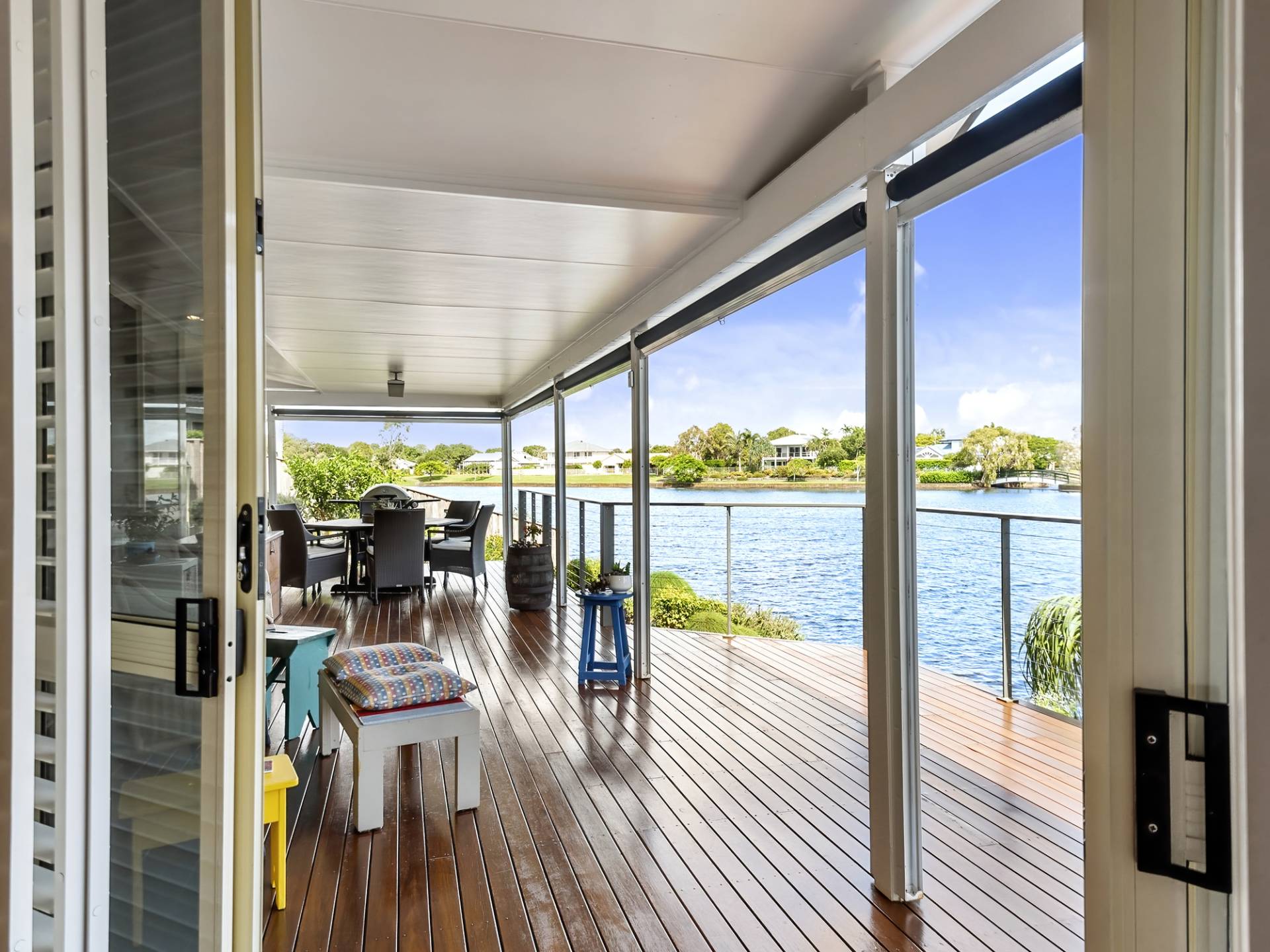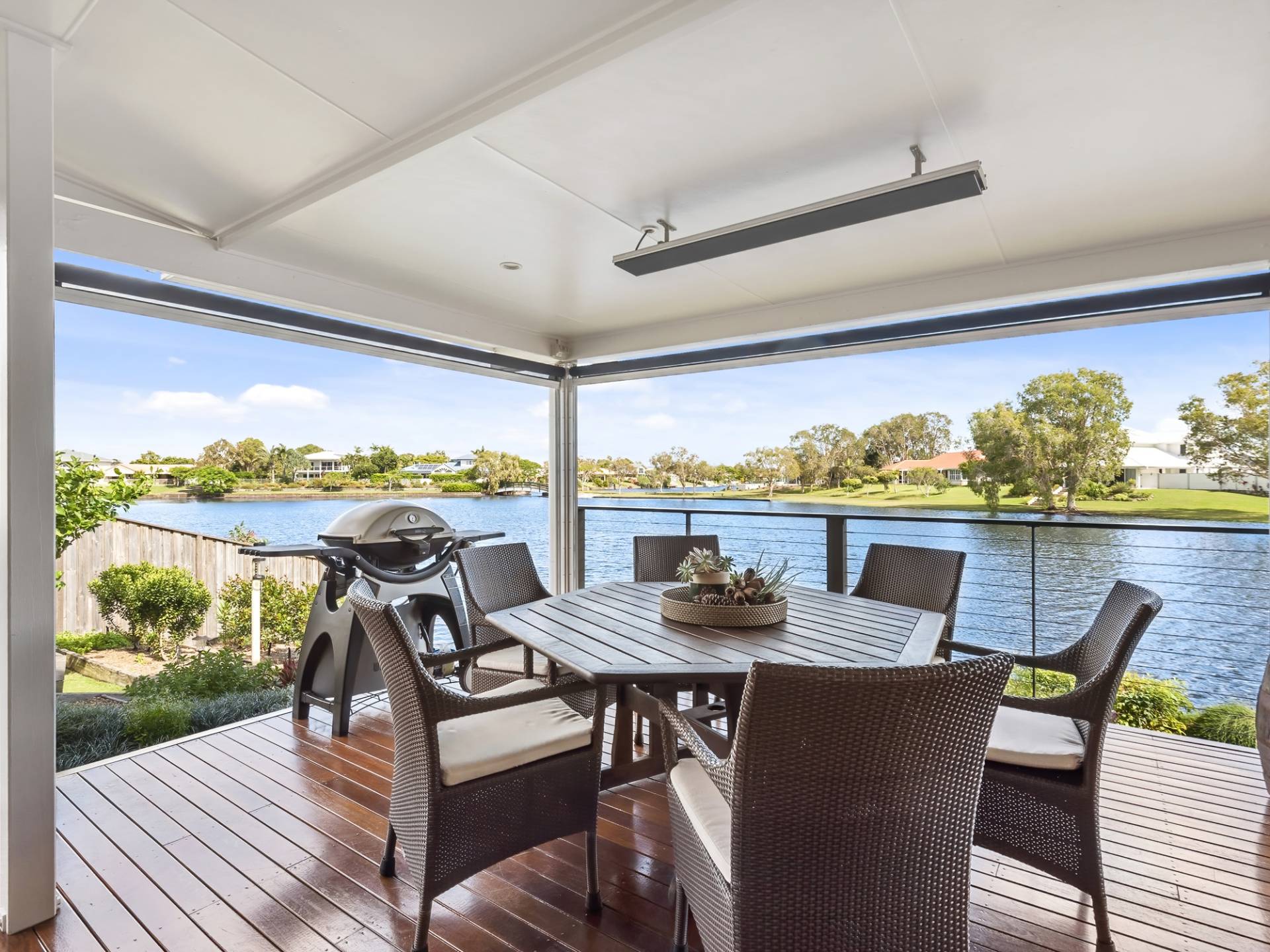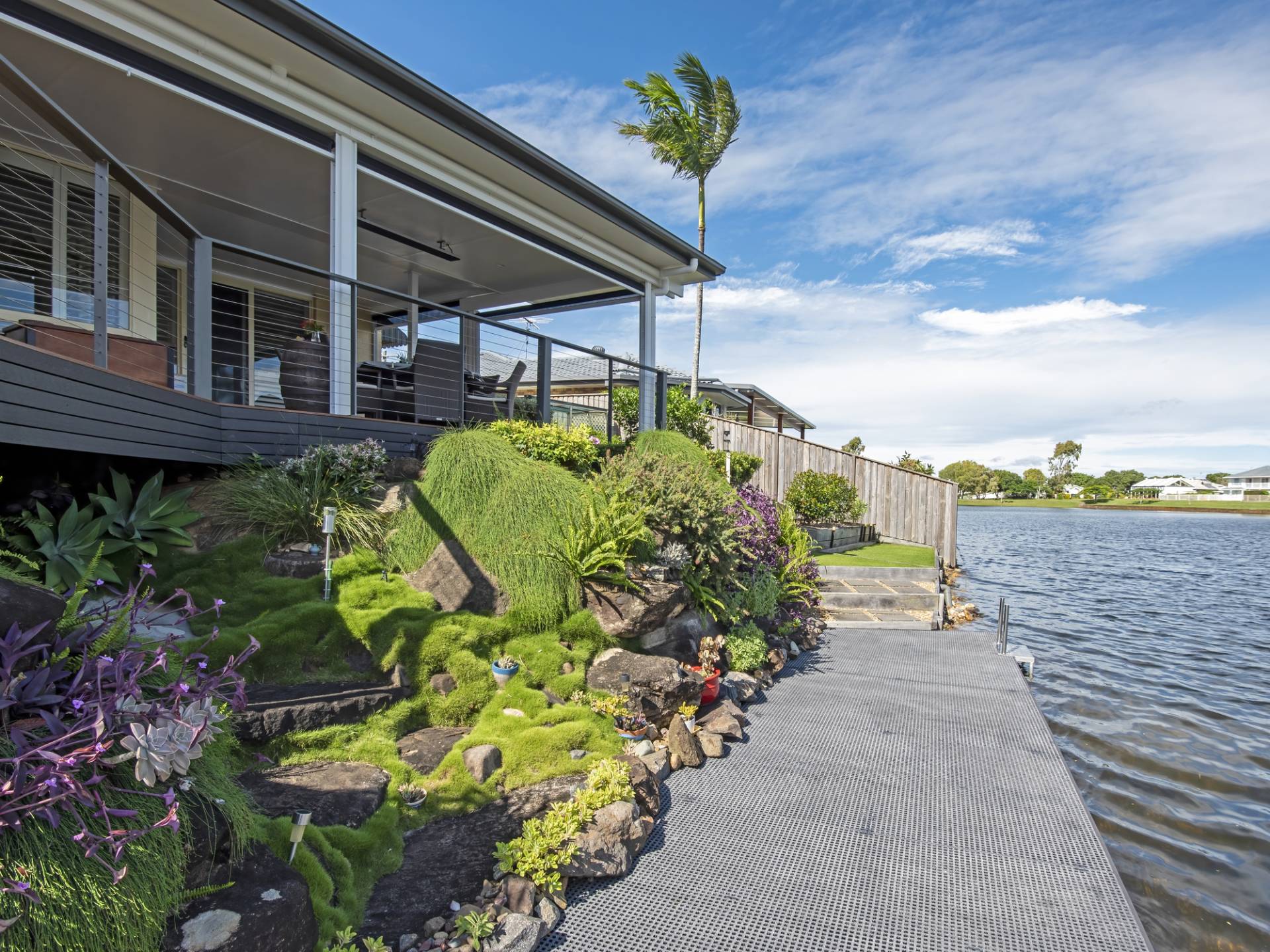 The kitchen is centrally located, ultra-modern in design and has plenty of bench and cupboard space. The dining and large living room lead out to an impressive undercover timber deck that spans the rear of the home with plenty of room for entertaining the largest of families. Pull-down blinds ensure comfortable living whatever the weather.  This area will soon become a favourite spot to relax and enjoy the water views at any time of the day. Step down from this area to a further deck where you can feed the fish or launch your kayak and start paddling away. There are plenty of locals that kayak daily for both exercise and socialise. What a great way to meet your neighbours!