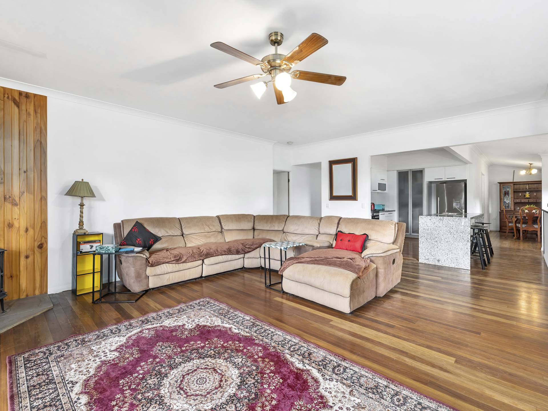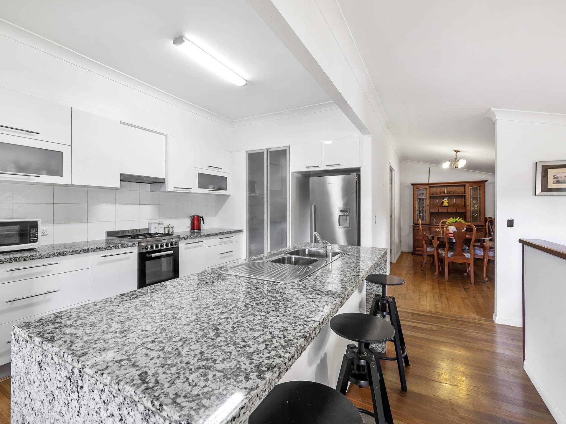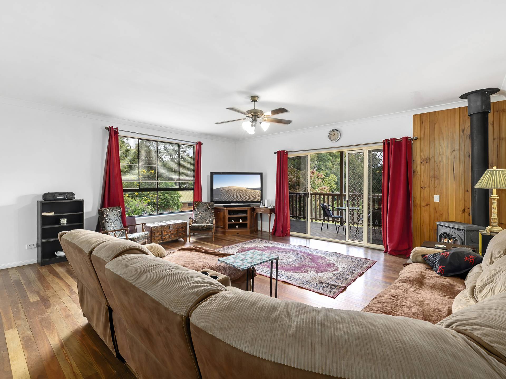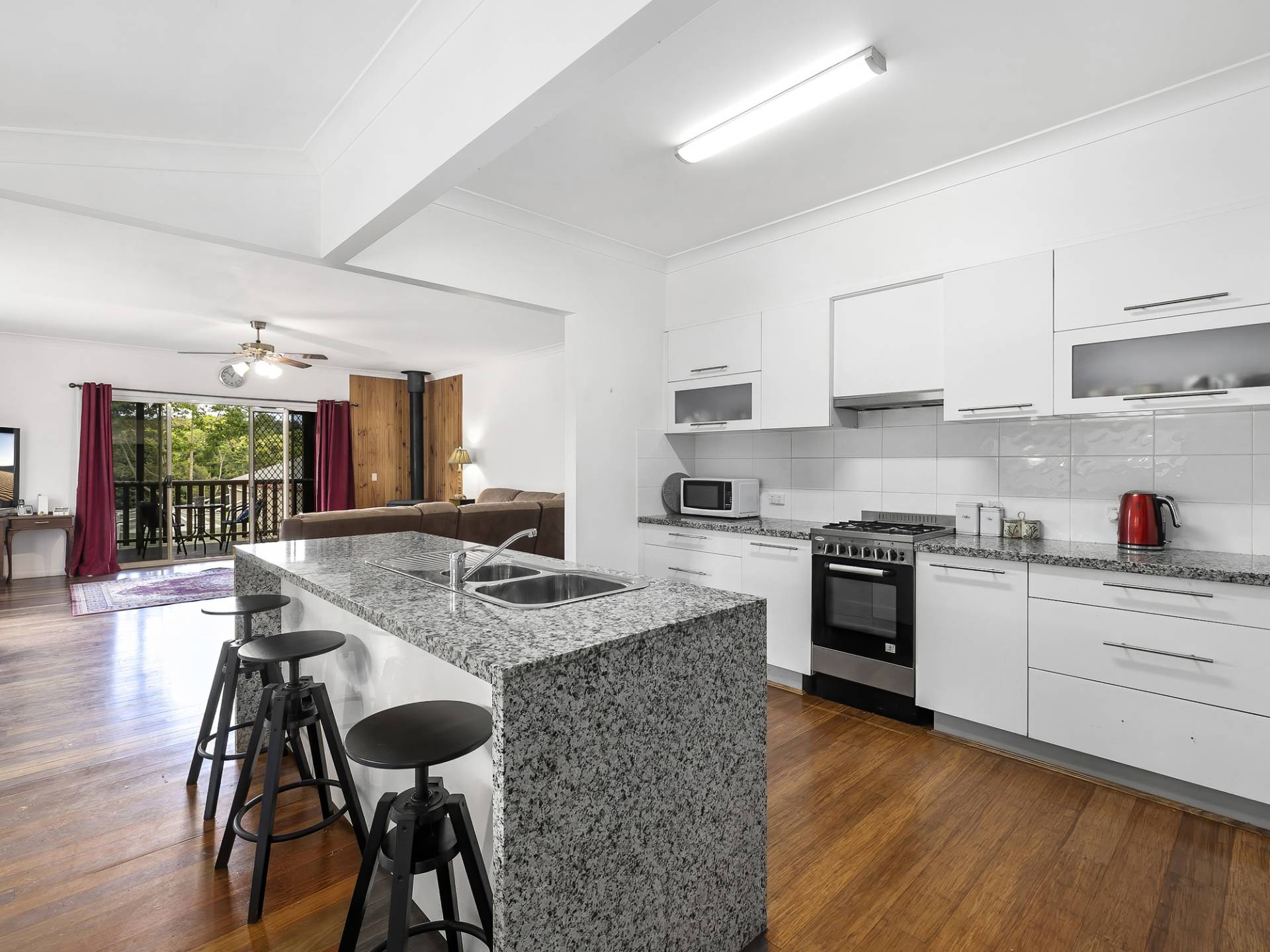The kitchen is at the heart of the home with stone benches, gas cooking and plenty of storage. There are several living rooms with one that leads outside to the back timber deck where lovely rural views are enjoyed.
