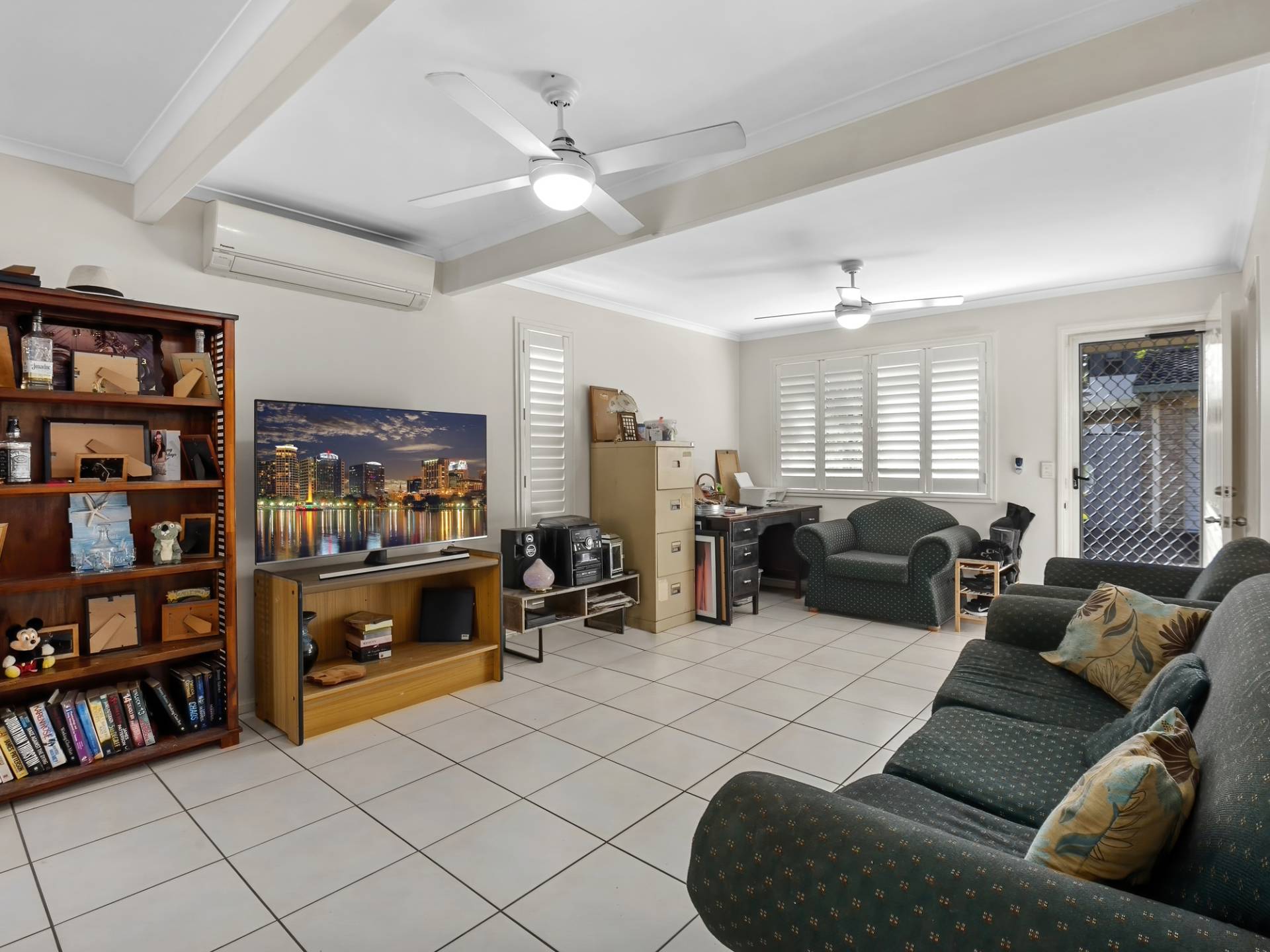 The spacious tiled living room is on ground level, is air-conditioned, has ceiling fans, security screens and leads out to the courtyard.