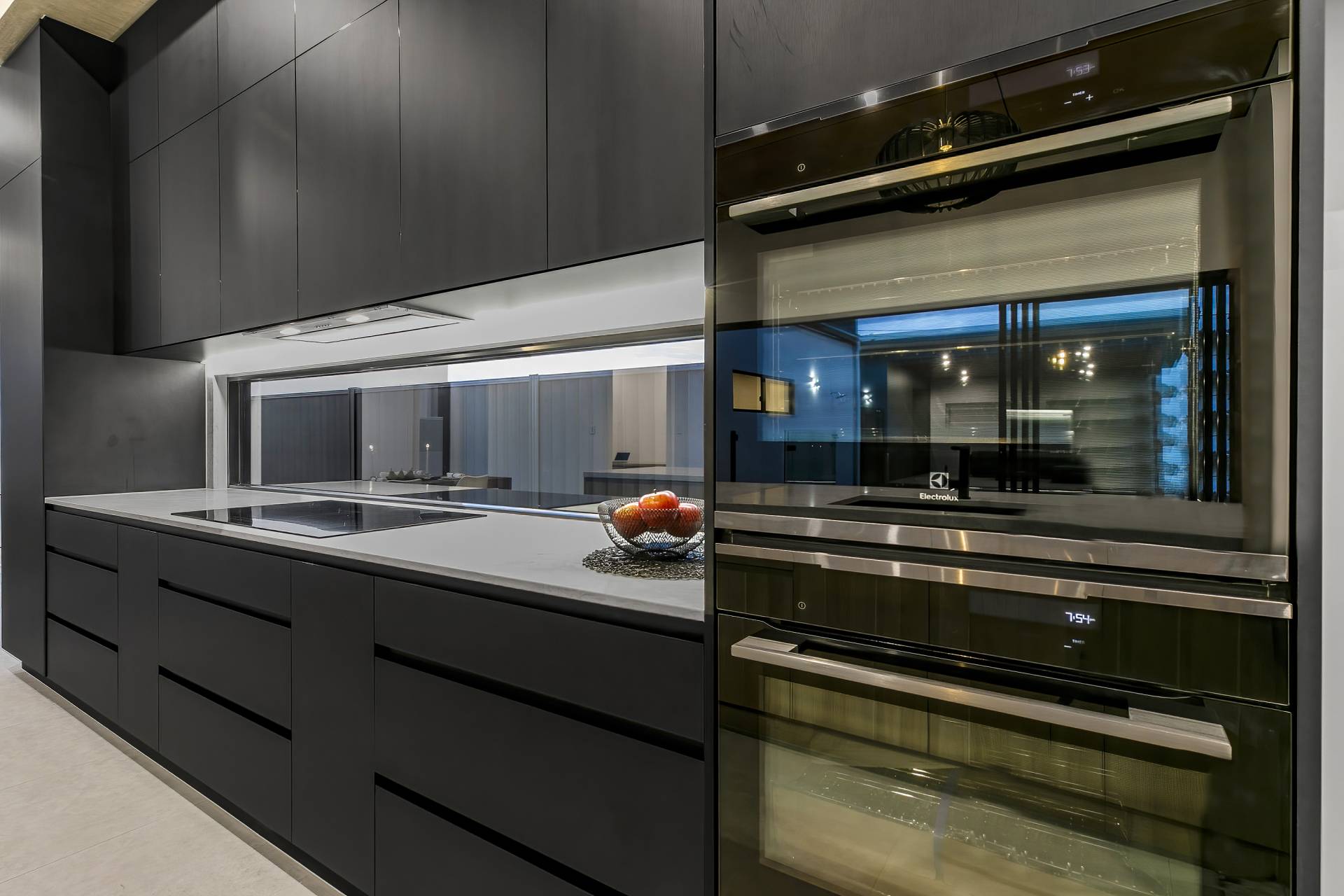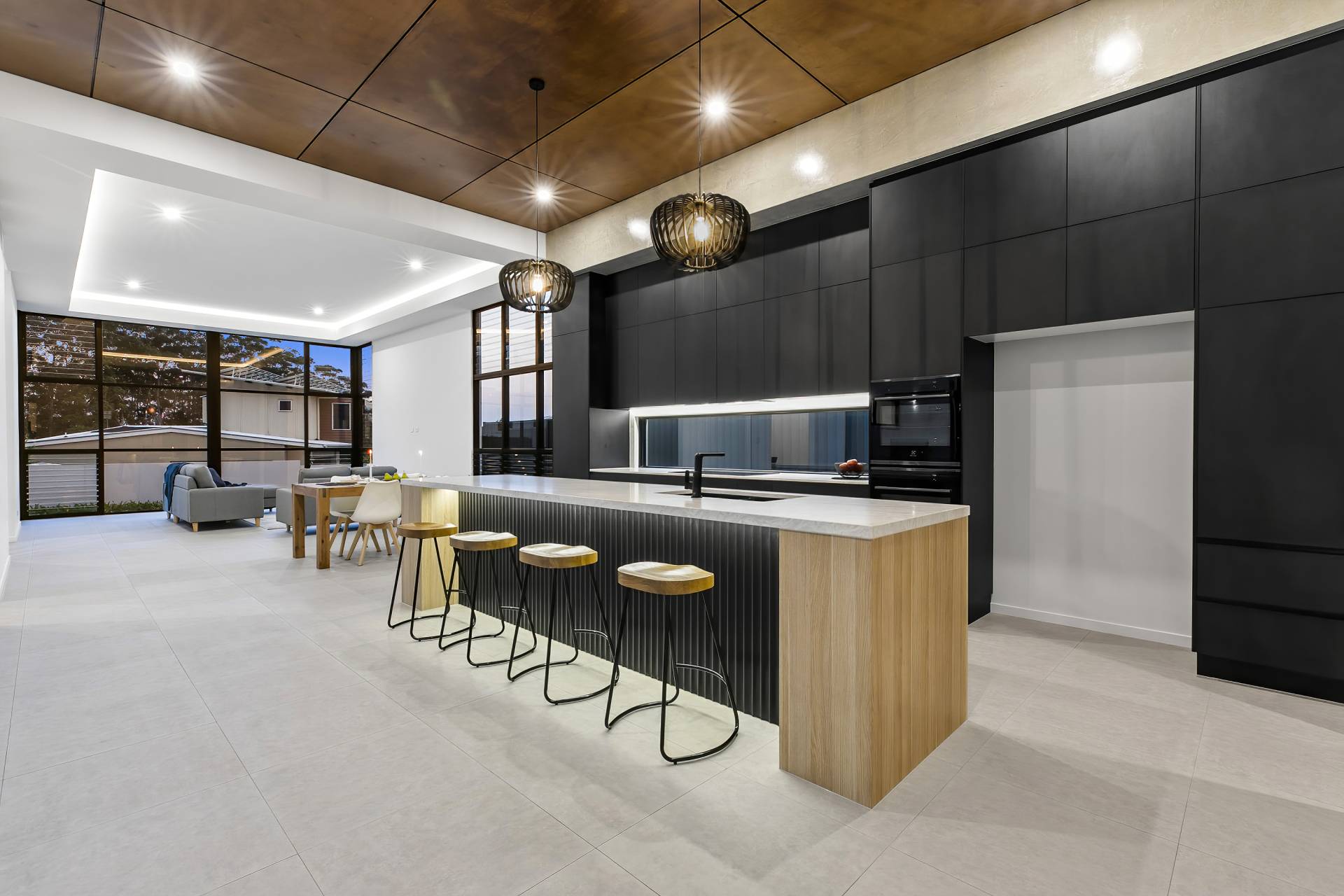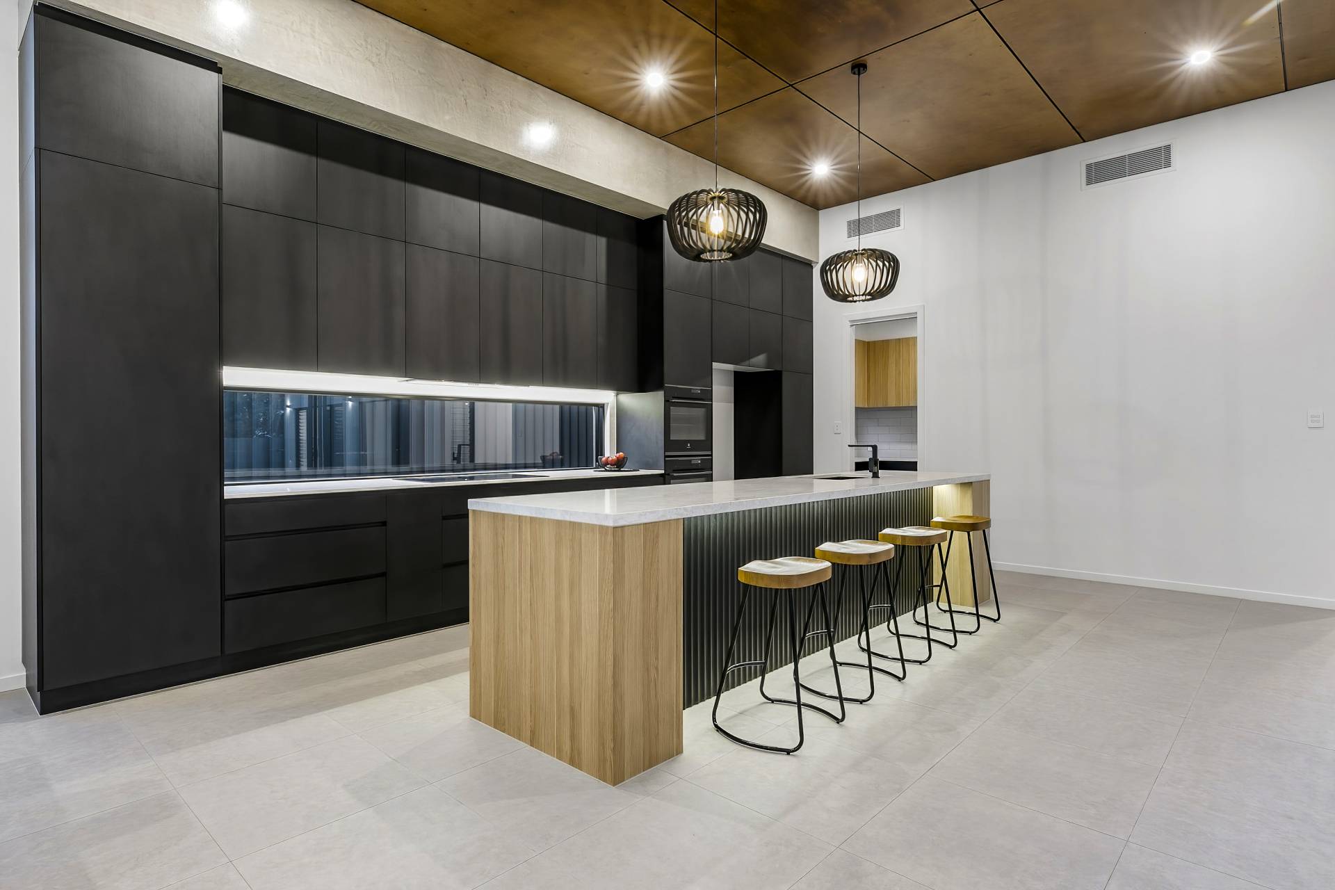 3.9 meter island bench highlighted by scalloped panel with black satin finish