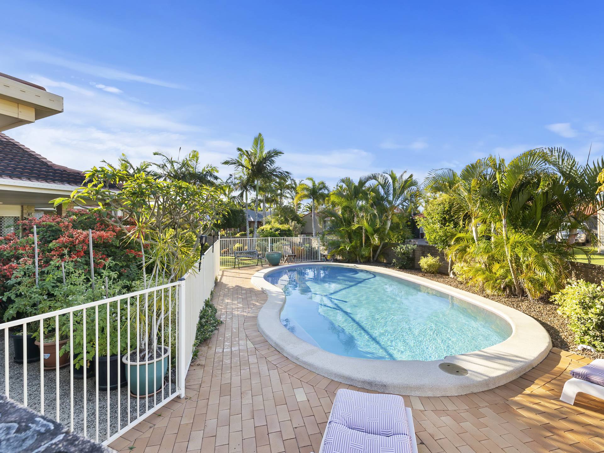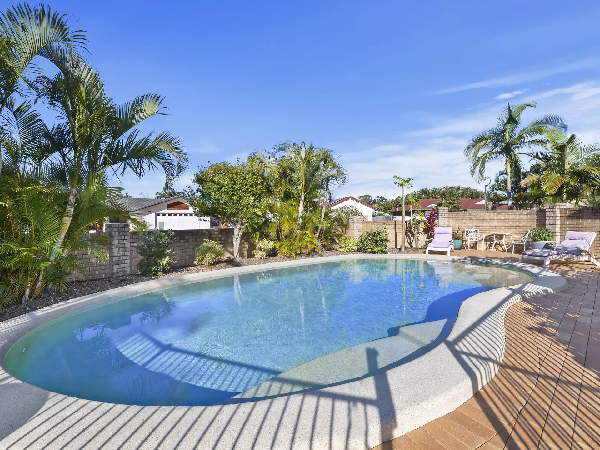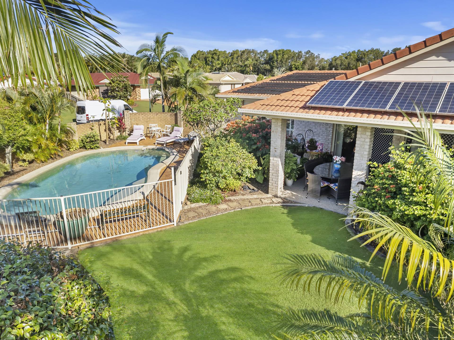 Lush tropical gardens overlook the sparkling solar heated inground swimming pool and the dual driveways offer secure storage for a large caravan or boat.
