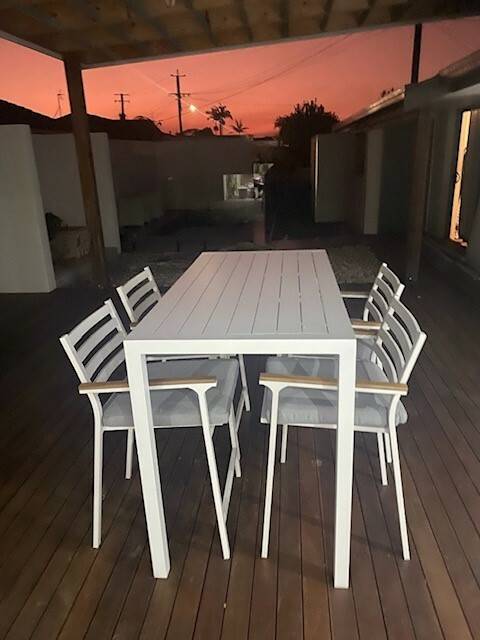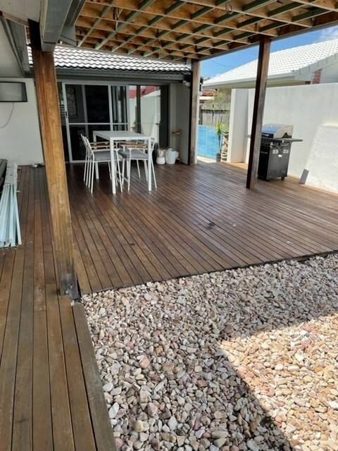 Well appointed patio area with timber decking with lovely pool area.