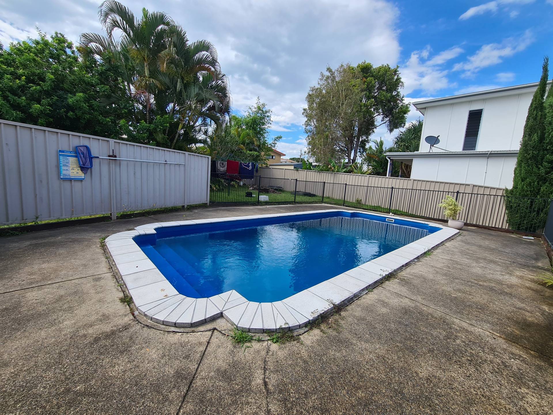 In ground pool with fully fenced yard and covered outdoor area.  off-street parking for two cars.