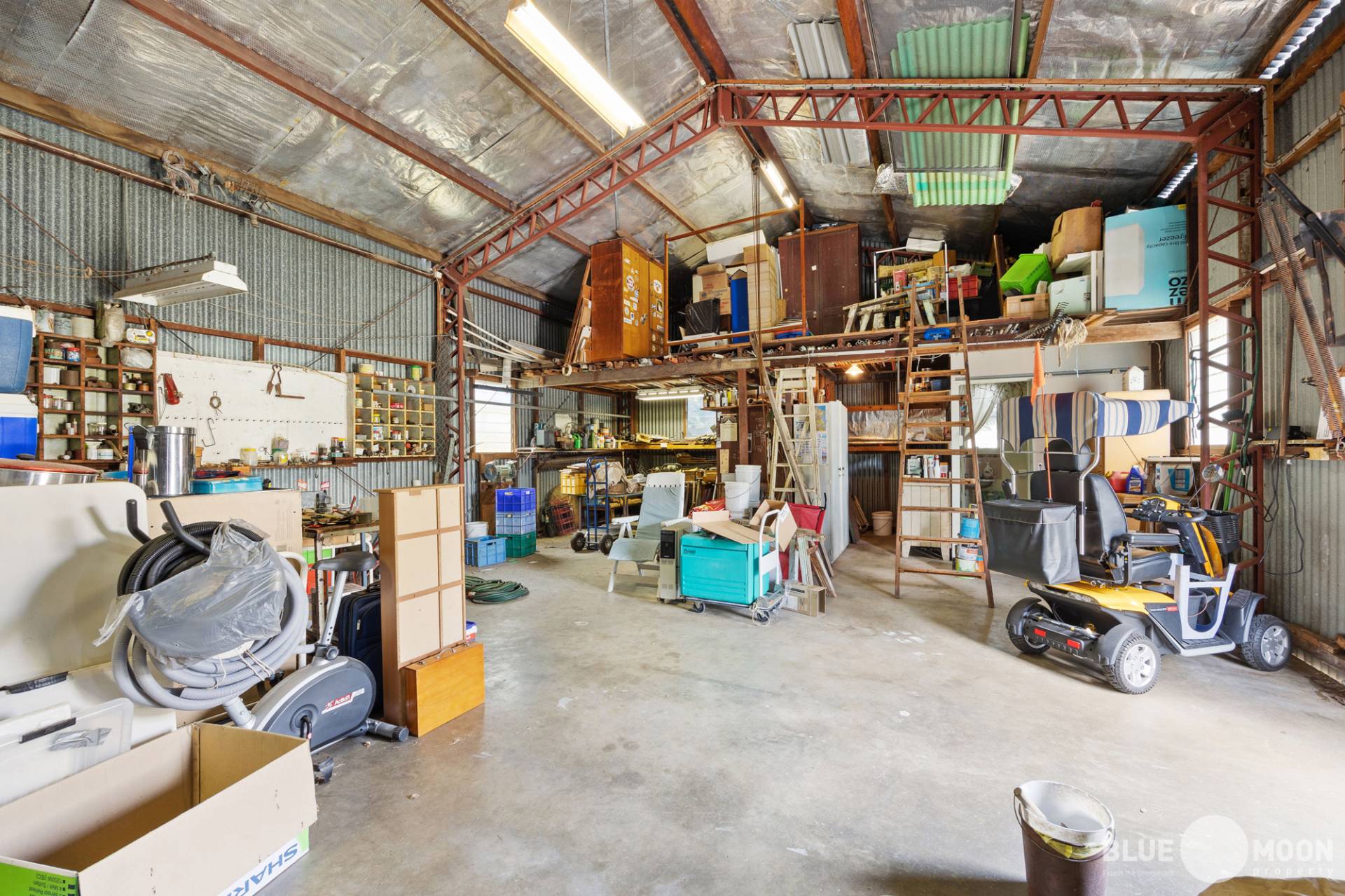 The large commercial shed offers loads of space for the car, boat and a workshop. And with its own pit for working on cars waiting to be rediscovered (pit currently filled in with sand due to the owners age) this shed has unlimited possibilities. The shed also has a mezzanine floor  providing an abundance of storage space and a bathroom with toilet and shower.
