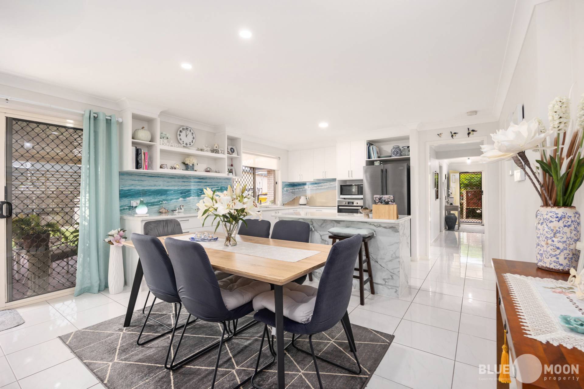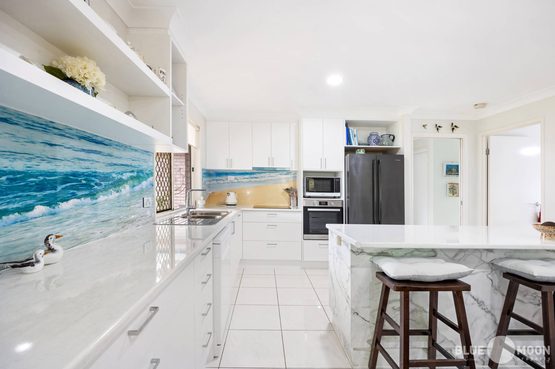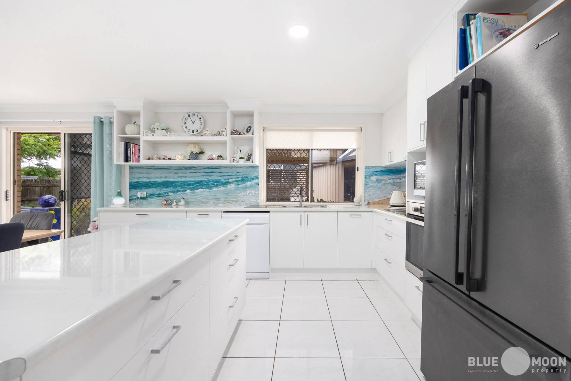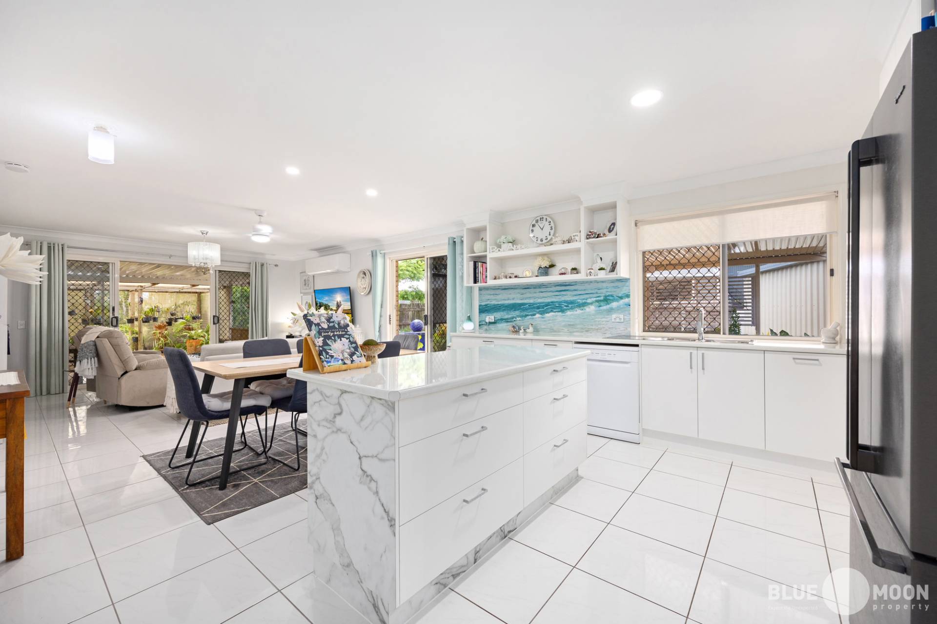 The modern kitchen with new appliances and electric cooktop, offers an abundance of bench and cupboard space while the stunning, beach themed splashbacks offer a perfect point of distinction to this well-designed home. The kitchen also overlooks the air-conditioned open plan living/dining area ensuring the home chief remains part of the conversation and is in air-conditioned comfort while preparing their culinary masterpieces.
