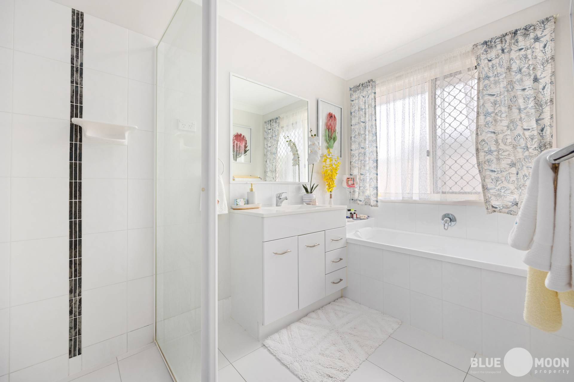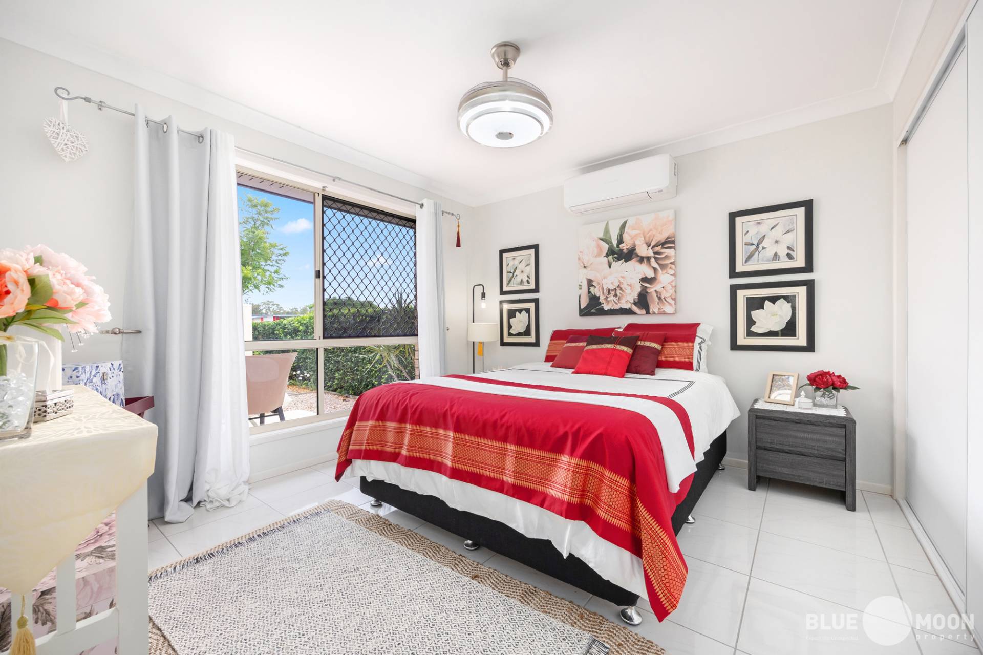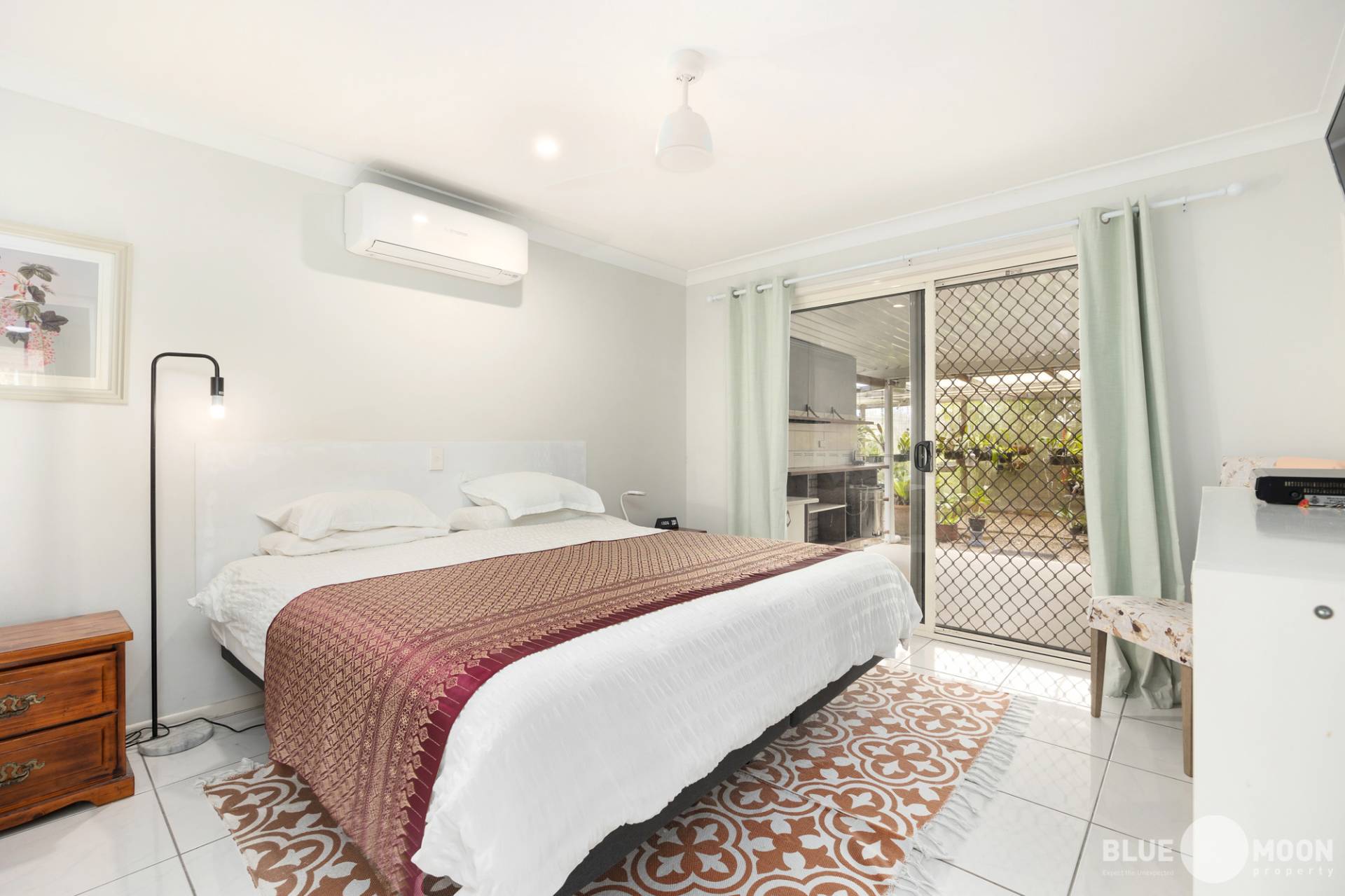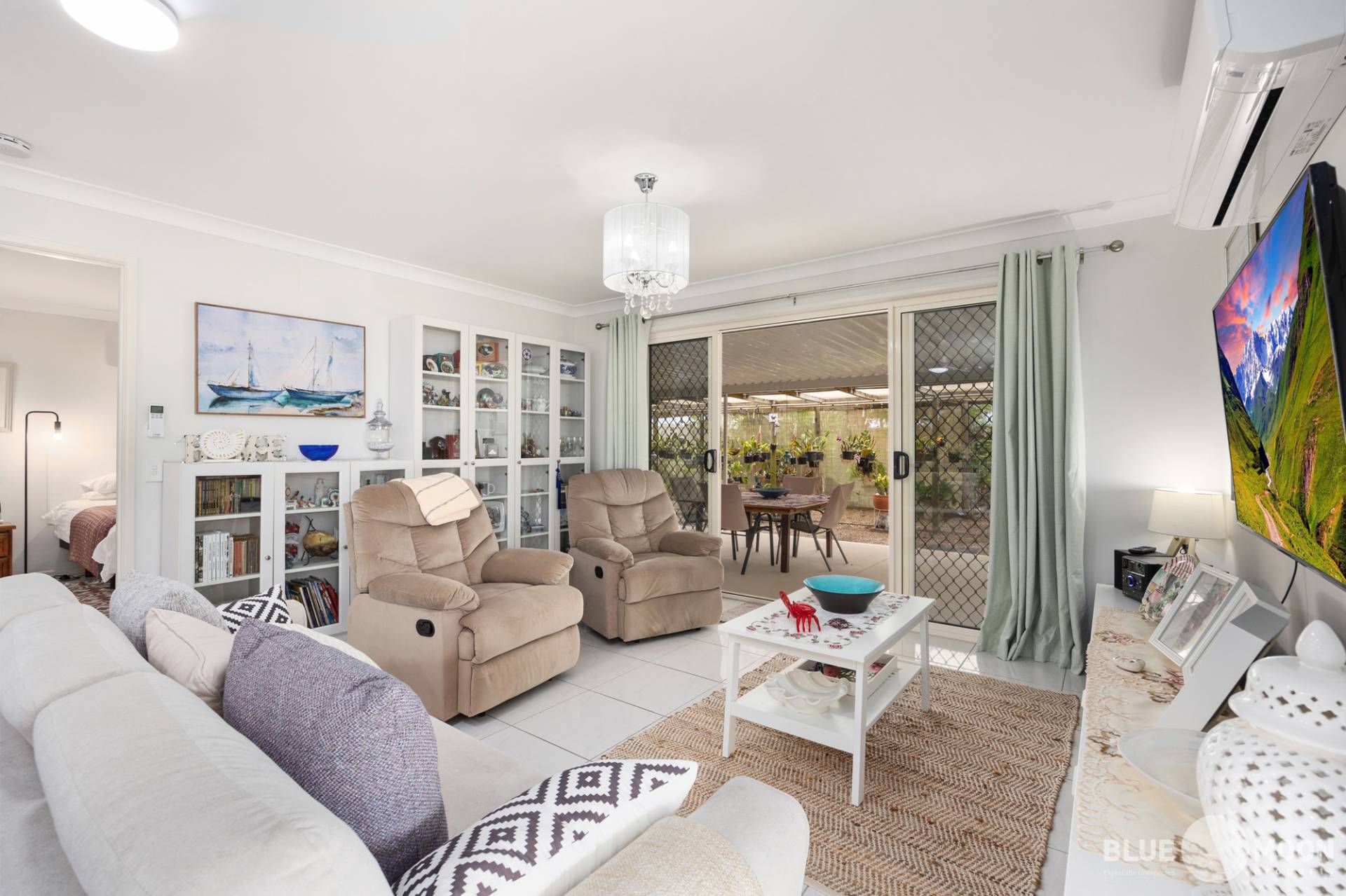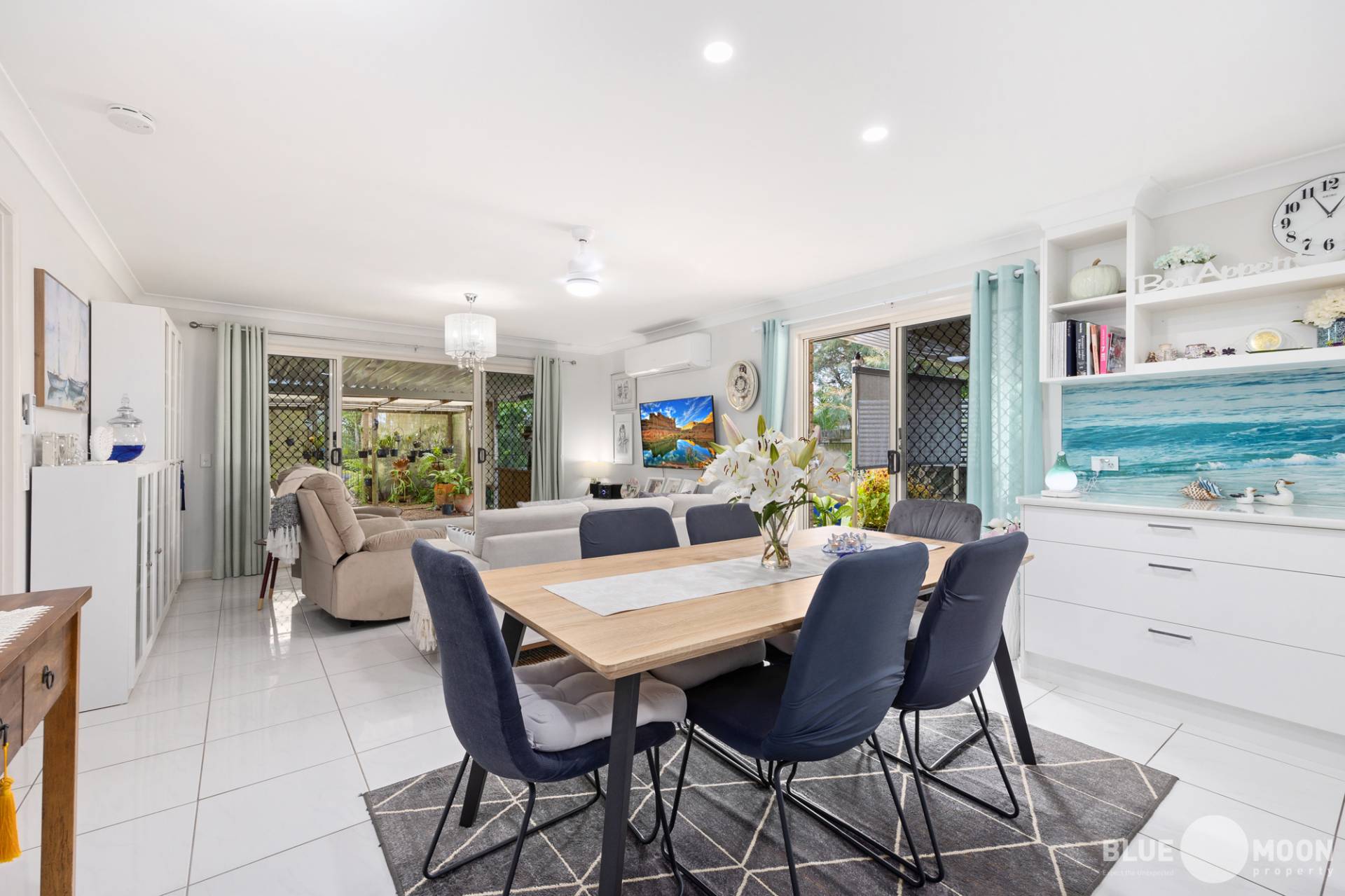 The modern kitchen with new appliances and electric cooktop, offers an abundance of bench and cupboard space while the stunning, beach themed splashbacks offer a perfect point of distinction to this well-designed home. The kitchen also overlooks the air-conditioned open plan living/dining area ensuring the home chief remains part of the conversation and is in air-conditioned comfort while preparing their culinary masterpieces.