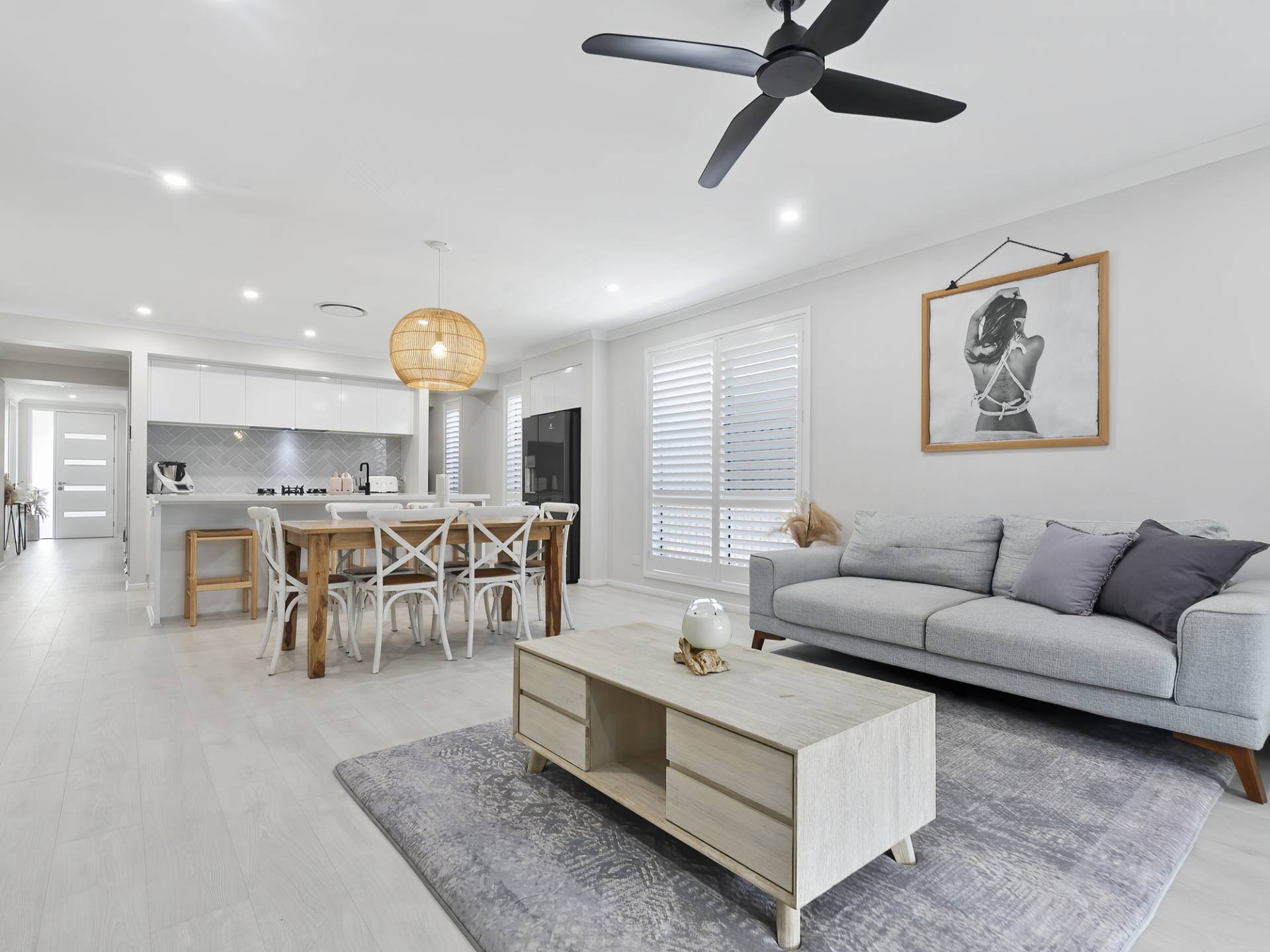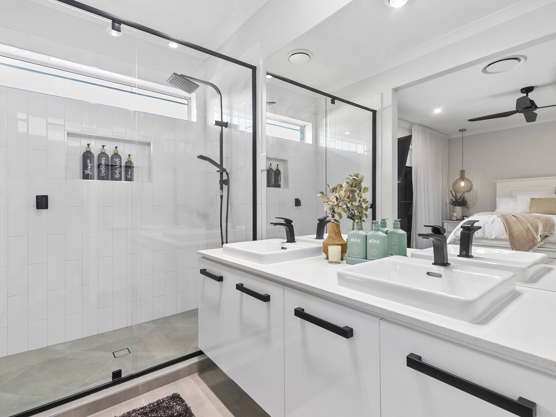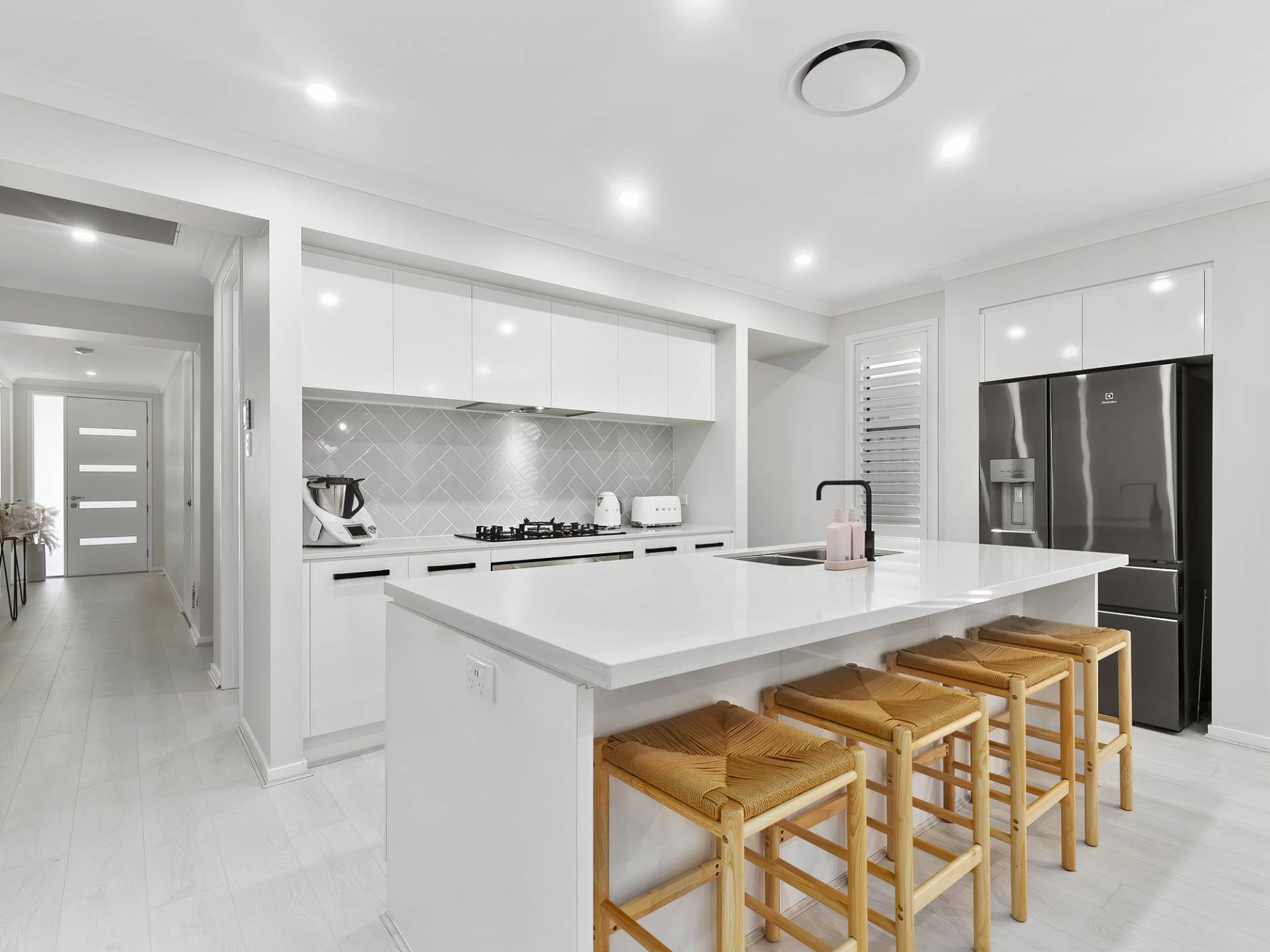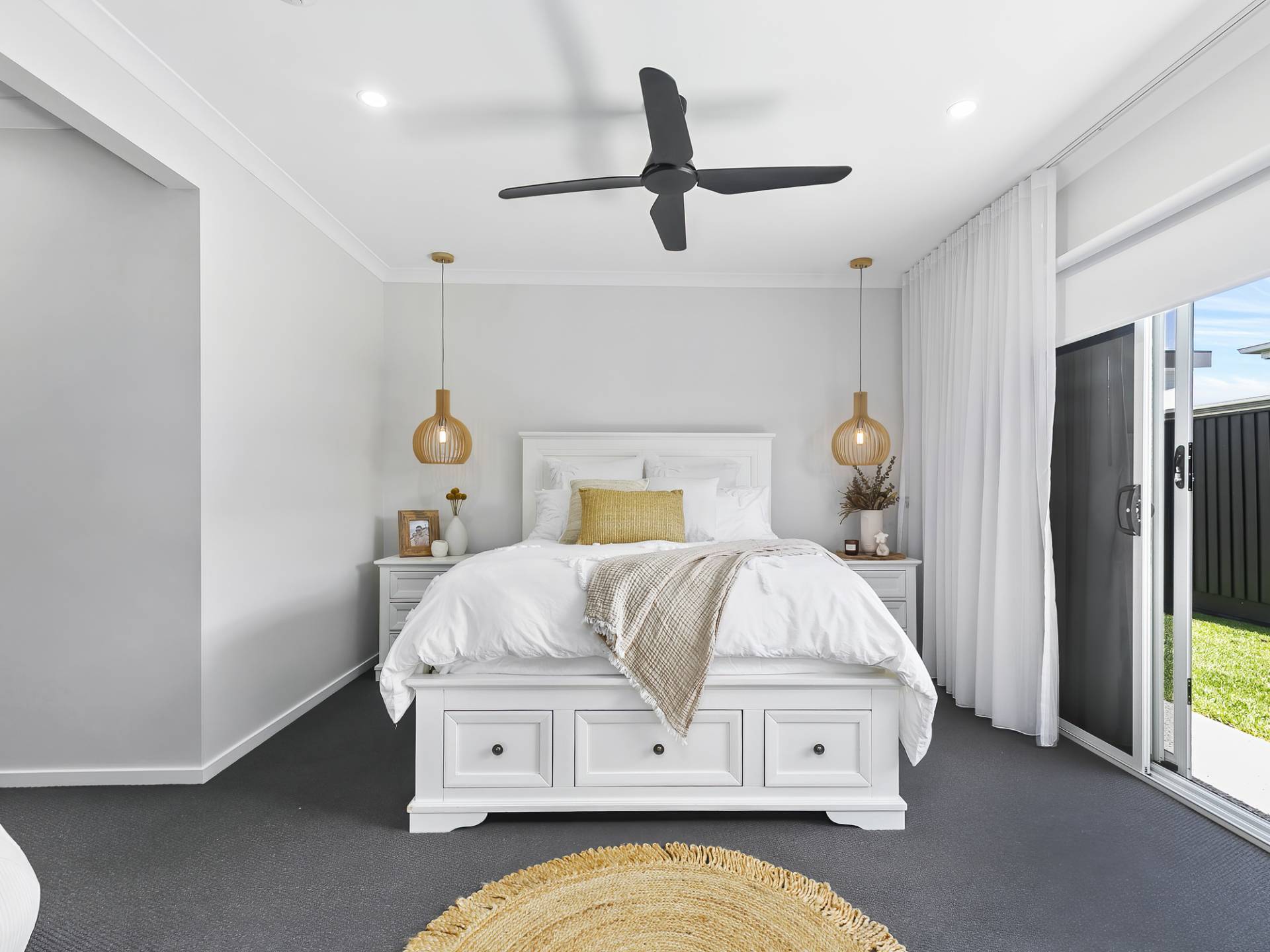 Providing a seamless flow from the entrance through to the alfresco area which is complemented by stacker doors letting you relax and or entertain effortlessly. With 3 light filled living areas, plus a stunning kitchen featuring a stylish 40mm Caesarstone island bench, stainless steel appliances and a functional butler’s pantry. The home’s clever design has the bedrooms dedicated to one side of the home for the whole family to enjoy and sneak away for that moment’s peace when needed. It’s a design that lets you coexist harmoniously everyday or celebrate special occasions in style.