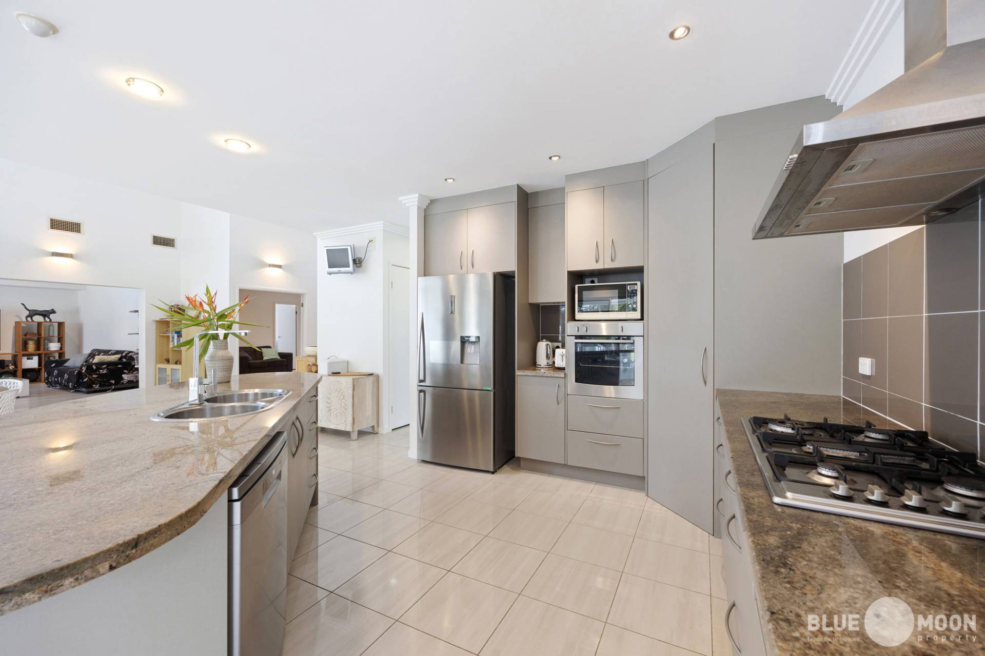 A Chef style kitchen is located downstairs which boasts a gas cooktop, stone benchtops, quality appliances including dishwasher,  island bench and plenty of bench and cupboard space.