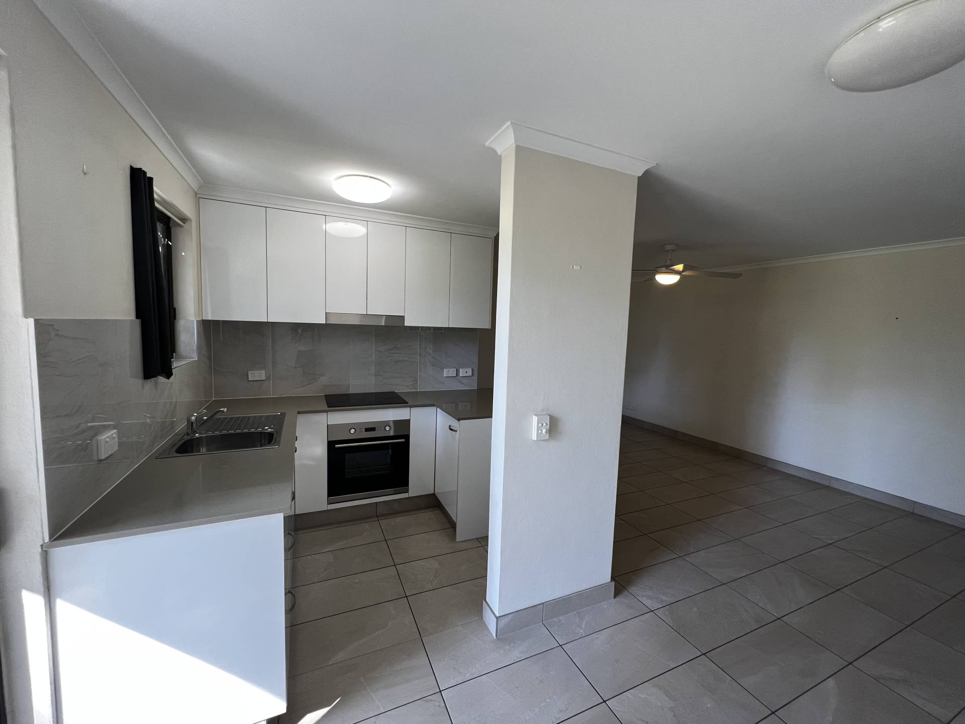 Open plan kitchen and lounge, full of natural light
