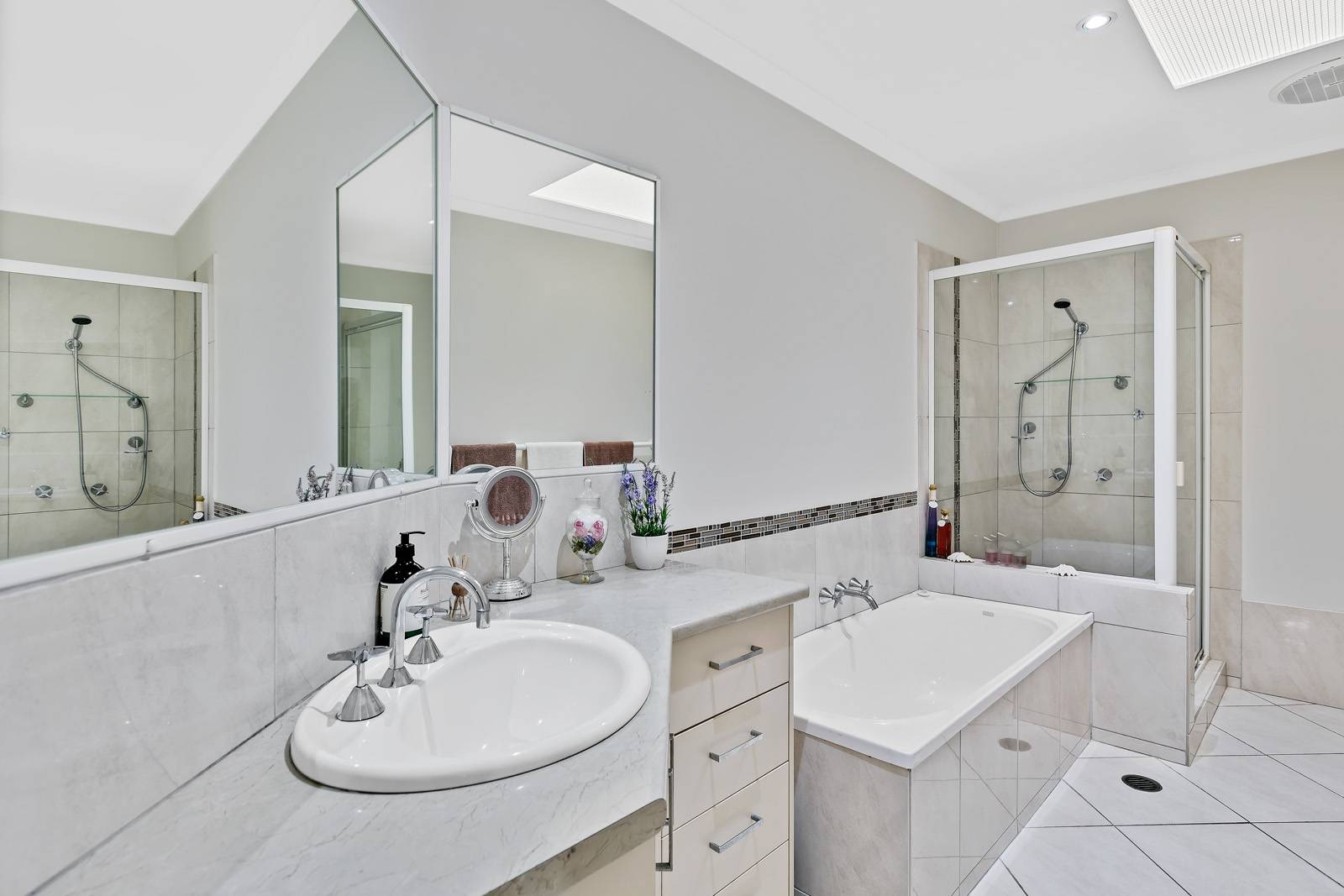 • Tidy bathroom with shower and bath