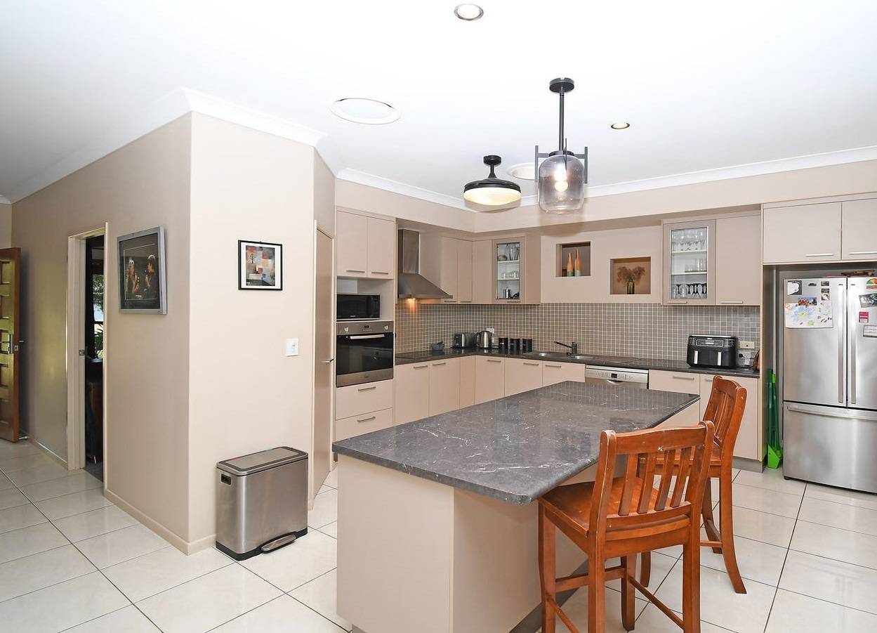 The modern kitchen is sleek and stylish boasting an island benchtop, stainless steel appliances, electric cooktop, electric oven and plenty of bench space and storage.