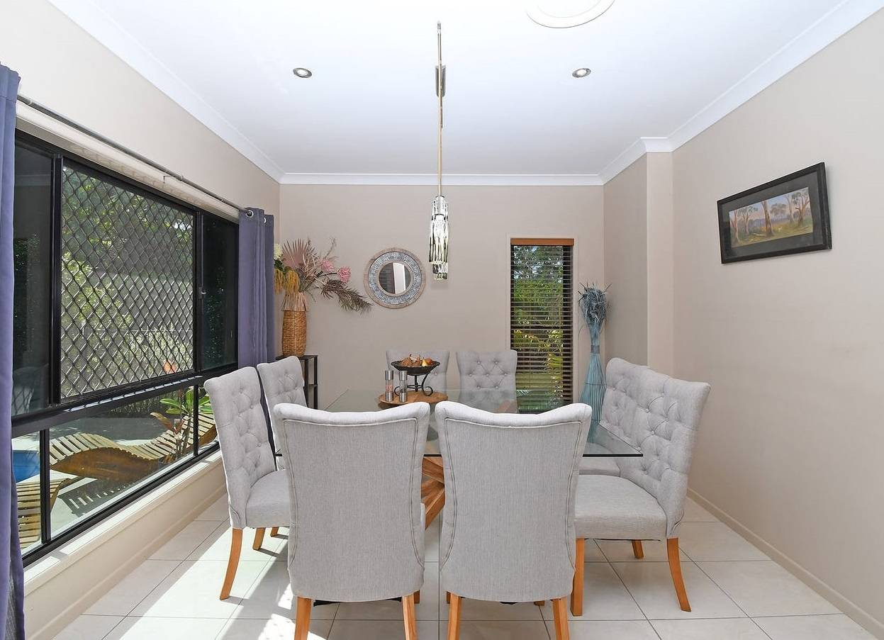 The separate dining room offers the perfect place to host elegant dinner parties in style while enjoying stunning views of the inground swimming pool through the large glass windows, providing a relaxed and open-feel dining environment.