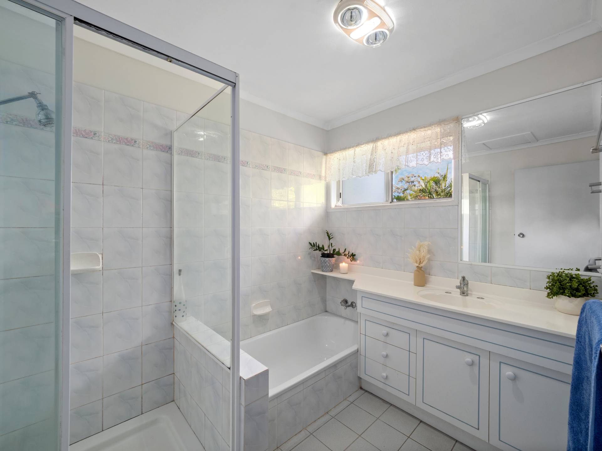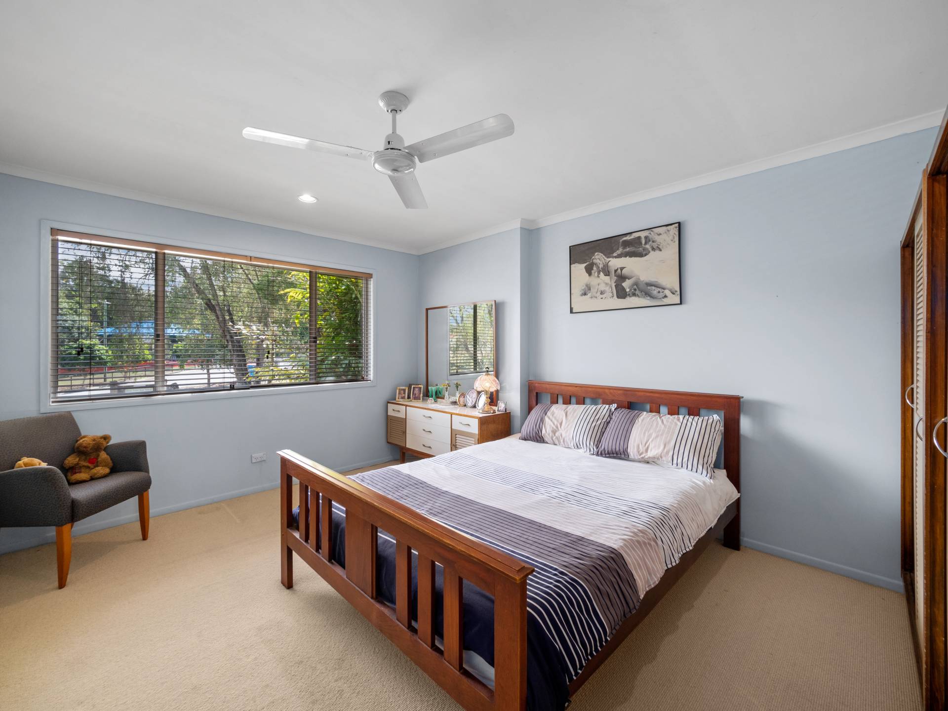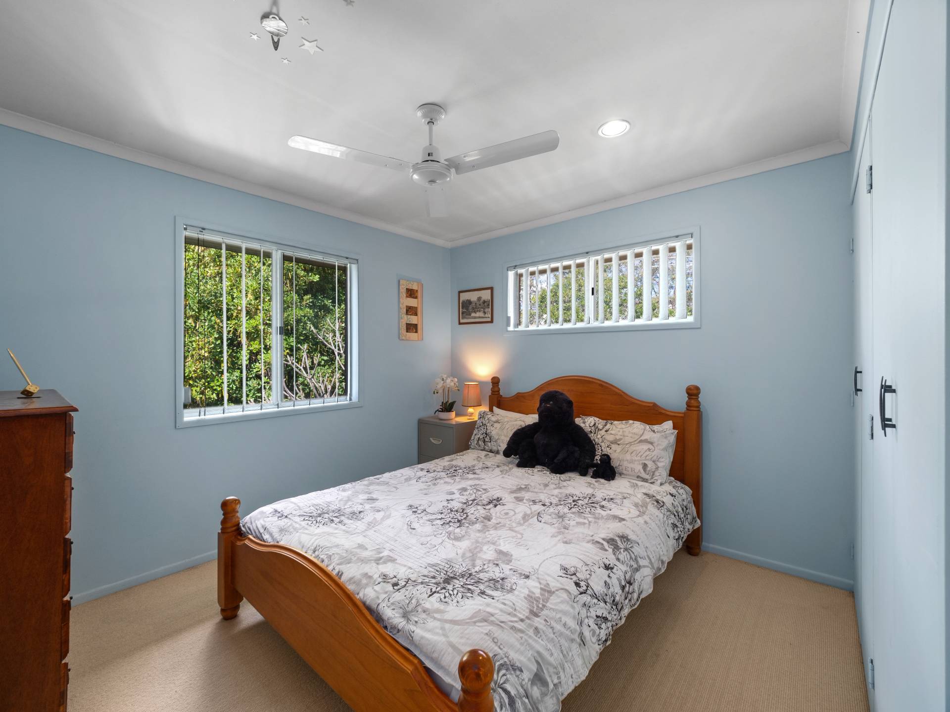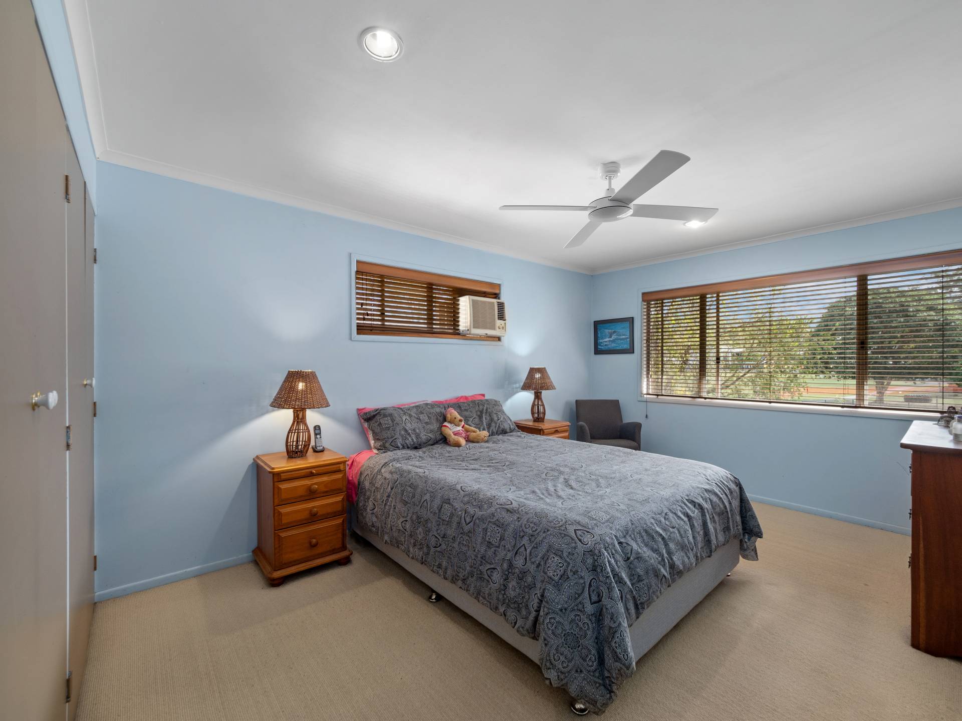 The home offers three bedrooms with fans, two including built-in wardrobes. The main bathroom offers a separate bath, shower and separate toilet.