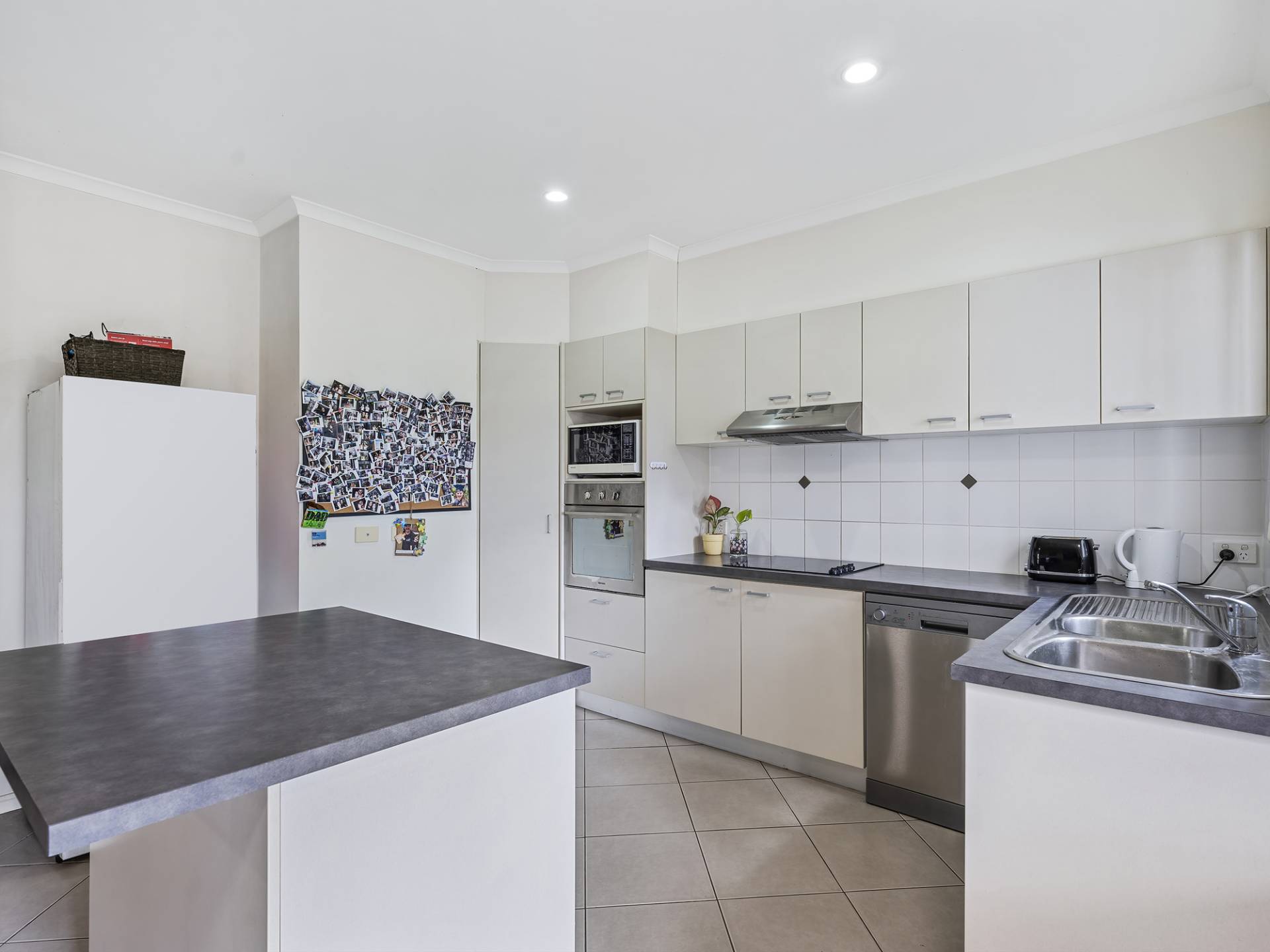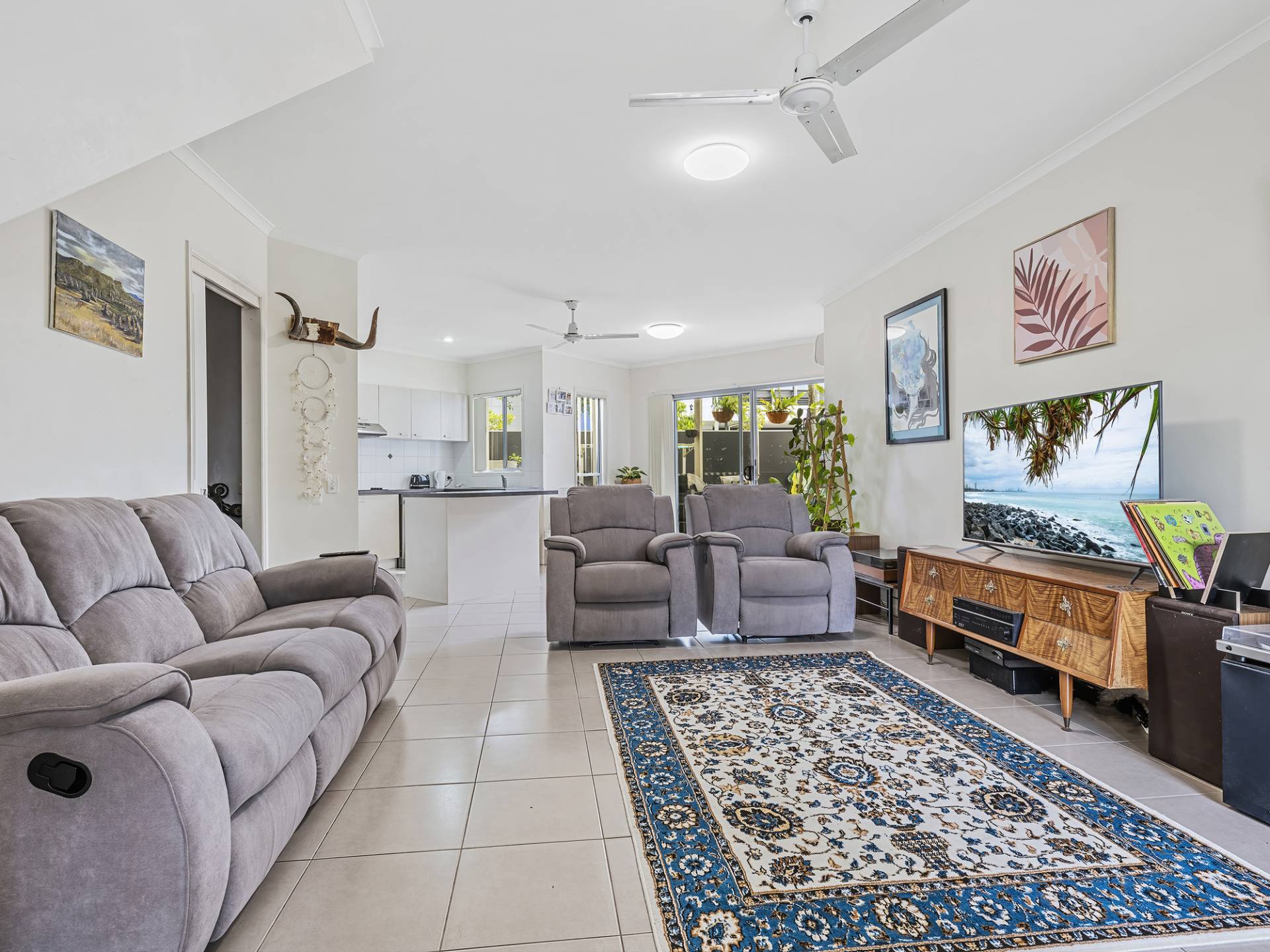 The air conditioned and tiled lower level offers a spacious open plan living and dining area providing a sense of space, opening on to the private courtyard. The kitchen features an Island bench, ample cupboard and bench space, separate laundry, toilet and internal access from the garage.