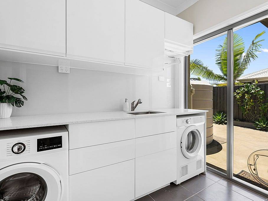 The laundry is next to the Master room and the Main bathroom with large bath tub, shower and separate toilet adjacent to the light and airy laundry. The laundry has ample bench space, under bench storage and overhead storage cupboards. The home is complete with a double remote lock up garage and a huge solar system.