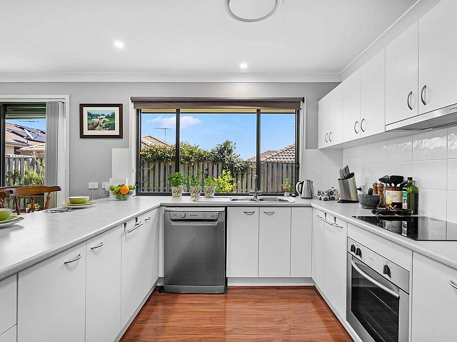 The kitchen is fitted with quality appliances including a dishwasher and electric appliances, with a window looking into the yard.