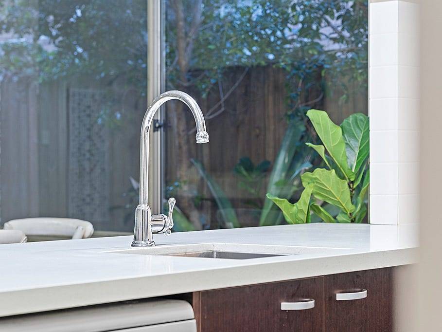 Leading out from the large lounge area is the undercover entertaining area overlooking the in-ground sparkling salt water pool also surrounded by an abundance of low maintenance plants and trees giving the outdoor area a tropical but beachy vibe.
