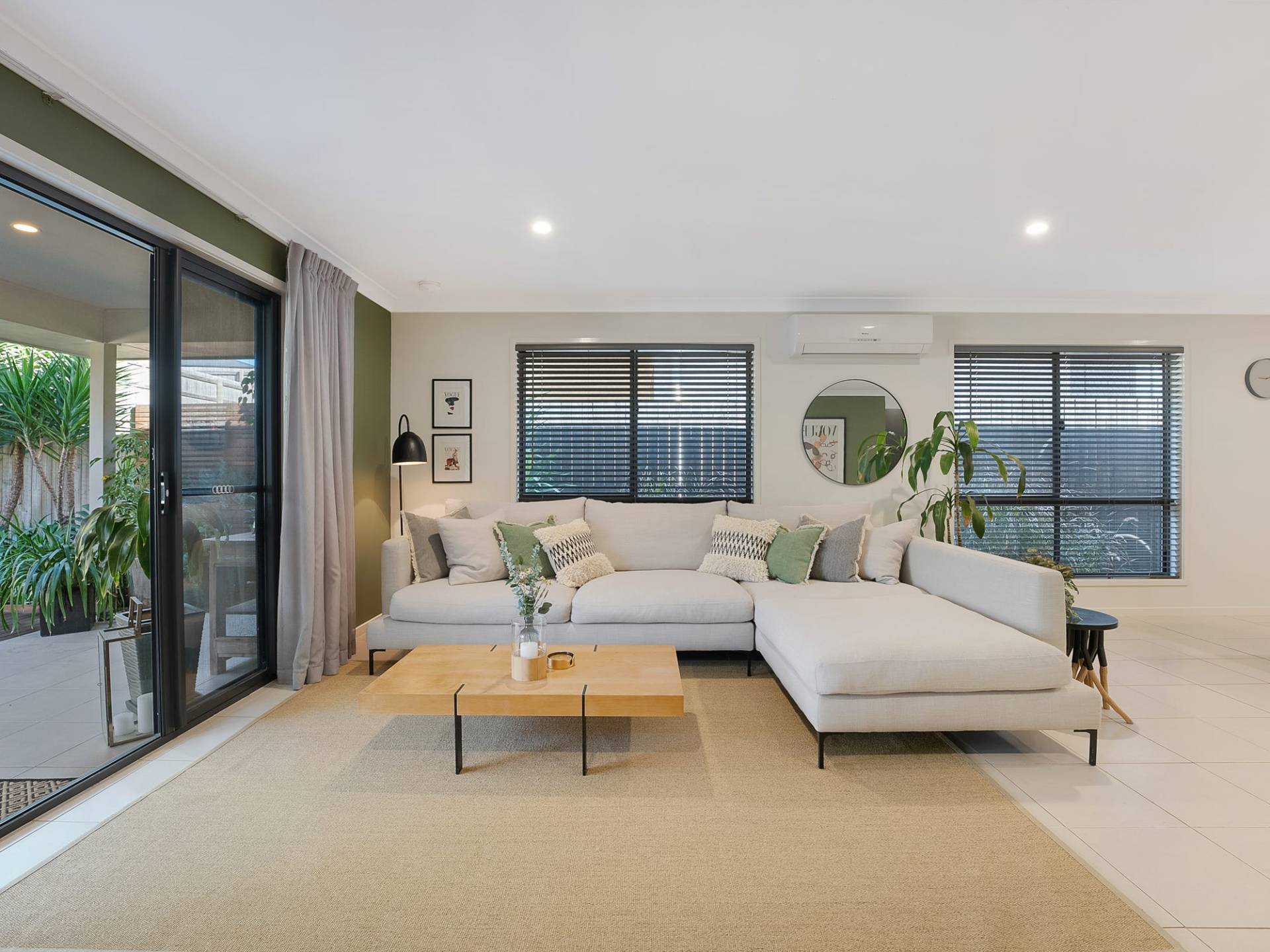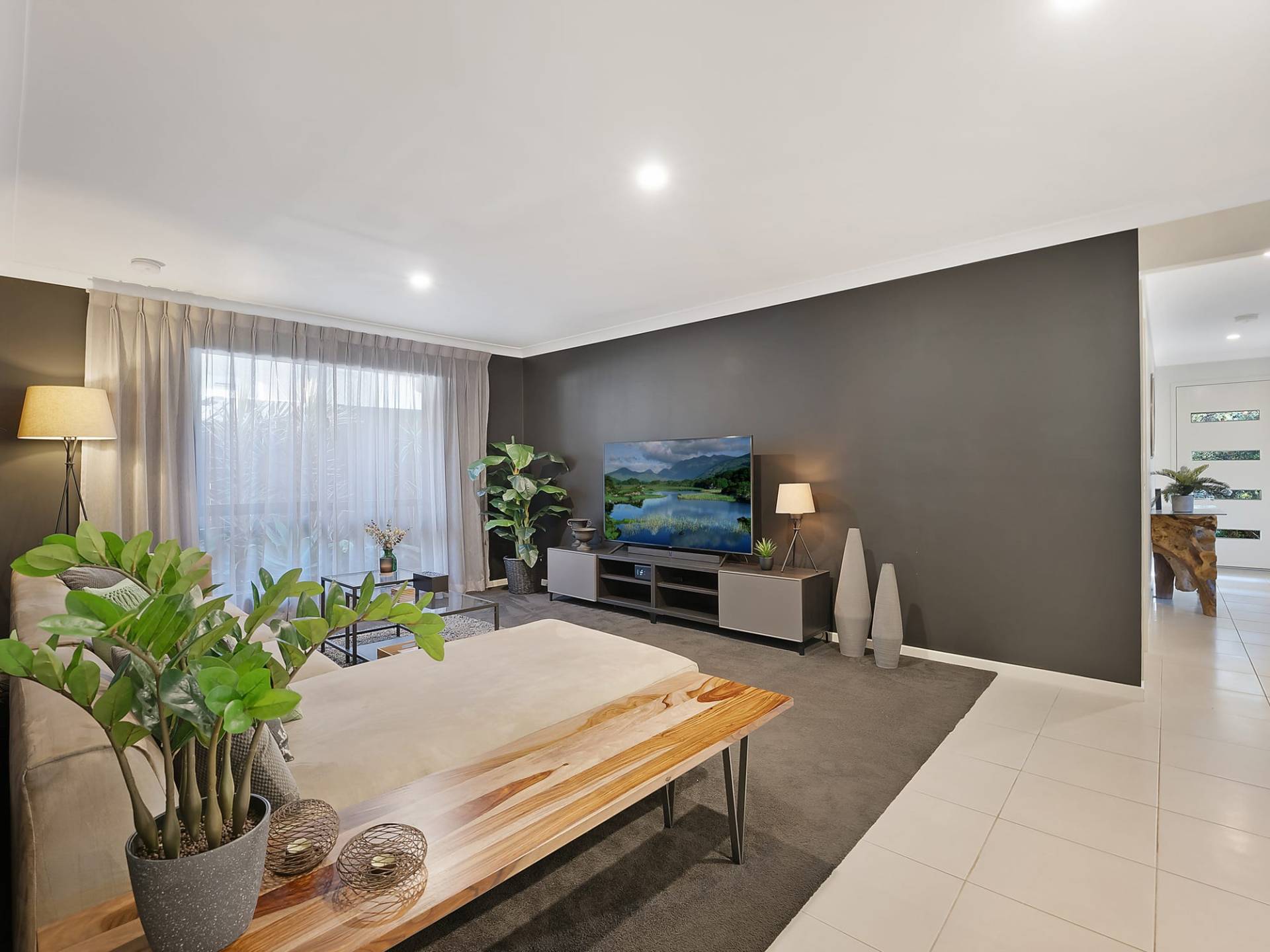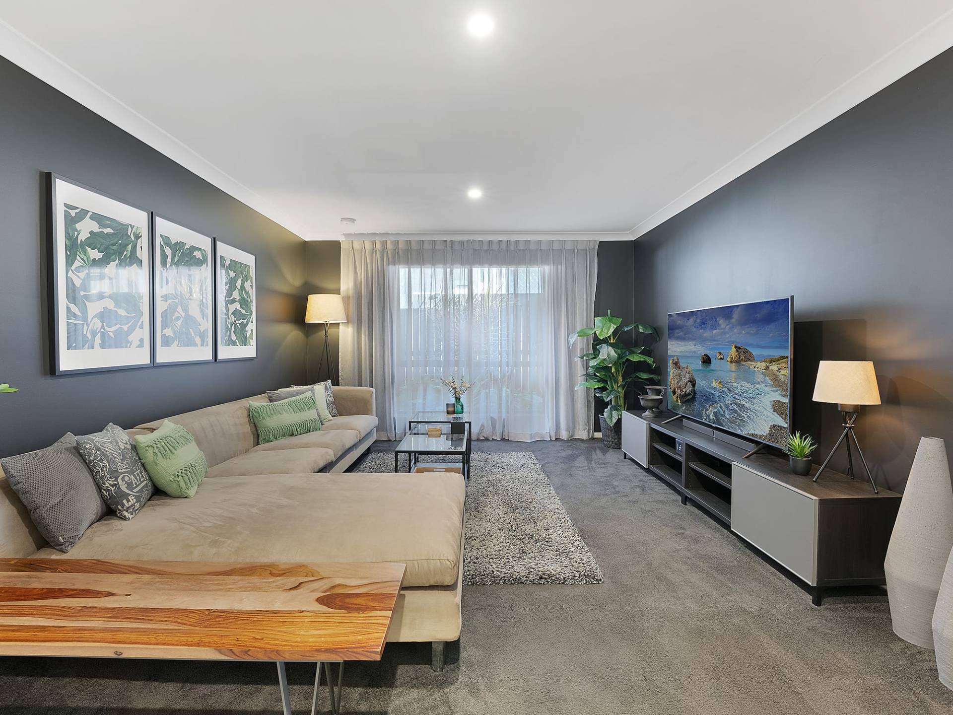 As you continue, you will be greeted by the large open carpeted lounge room which has a warm and welcoming vibe with gorgeous feature walls and sheer curtains giving off that homely feeling.