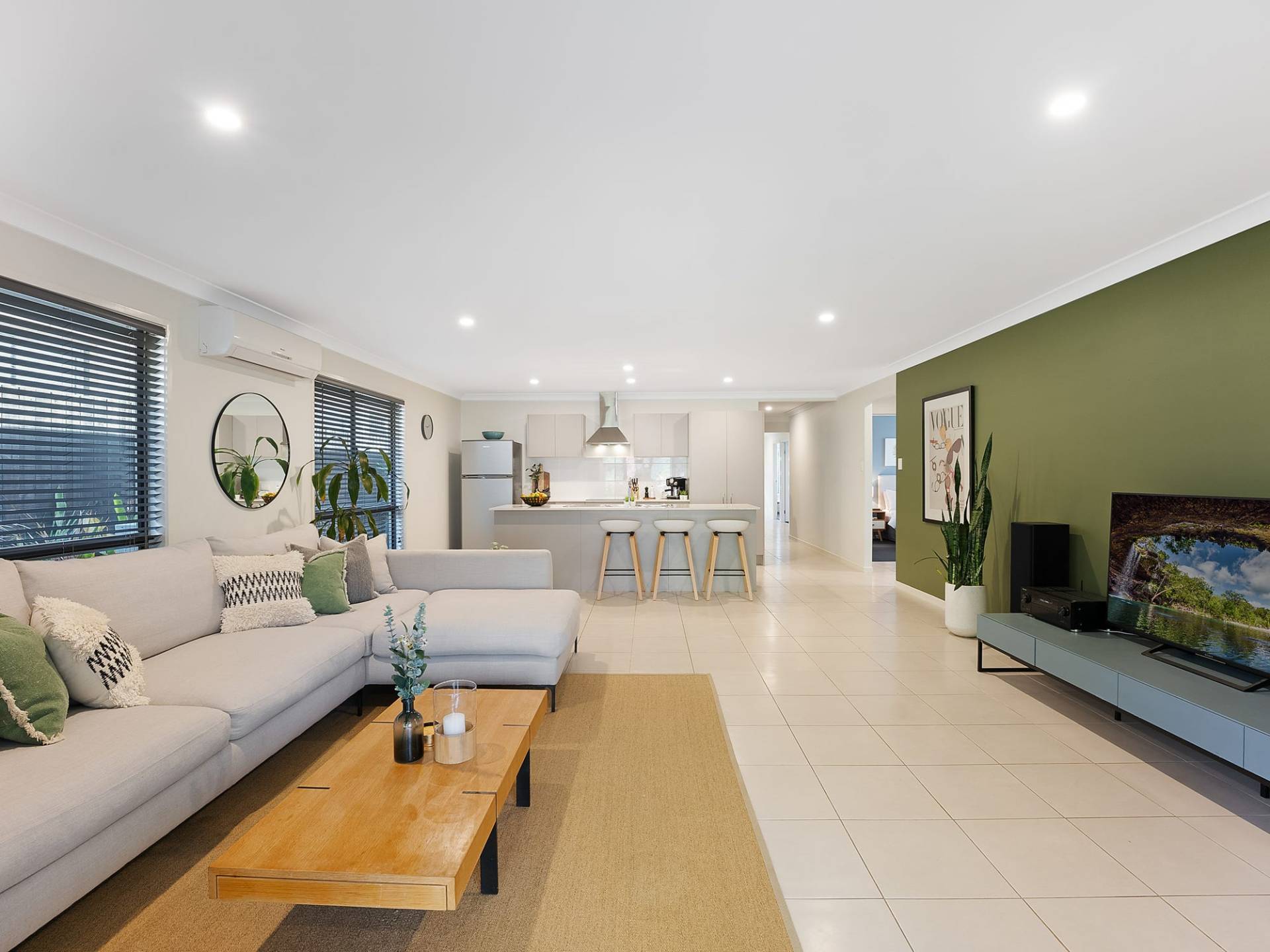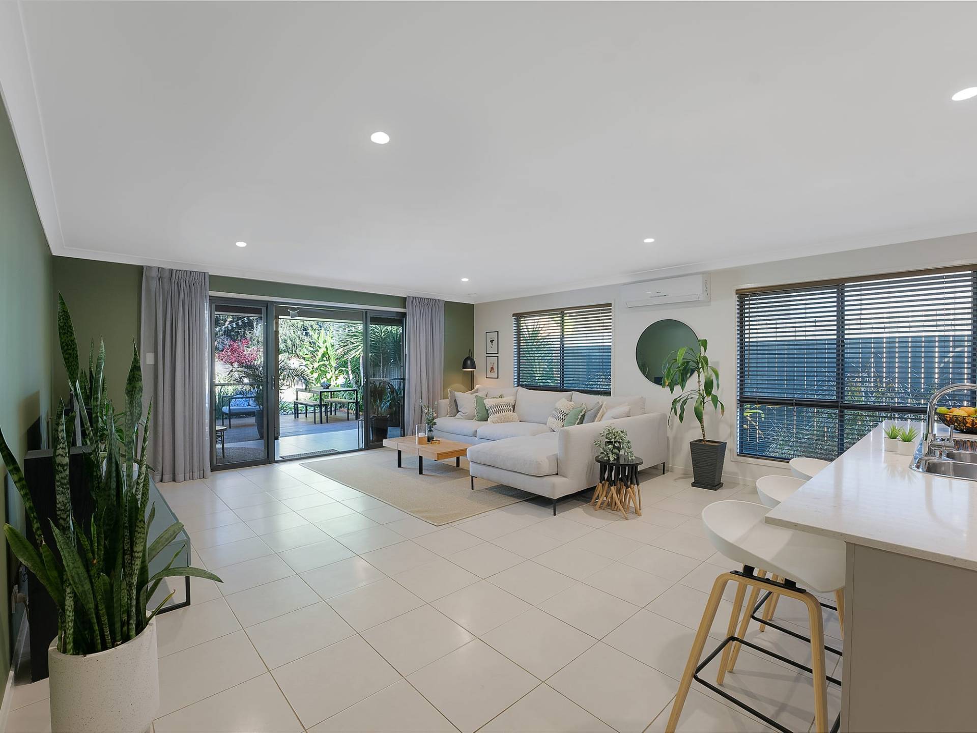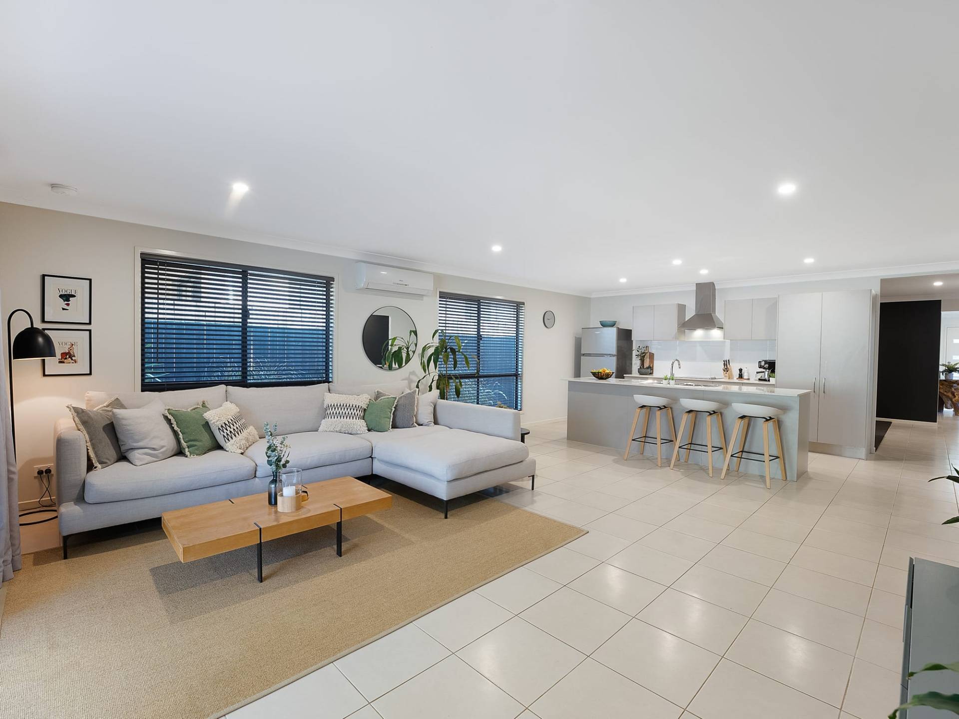 As you continue, you will be greeted by the large open carpeted lounge room which has a warm and welcoming vibe with gorgeous feature walls and sheer curtains giving off that homely feeling.