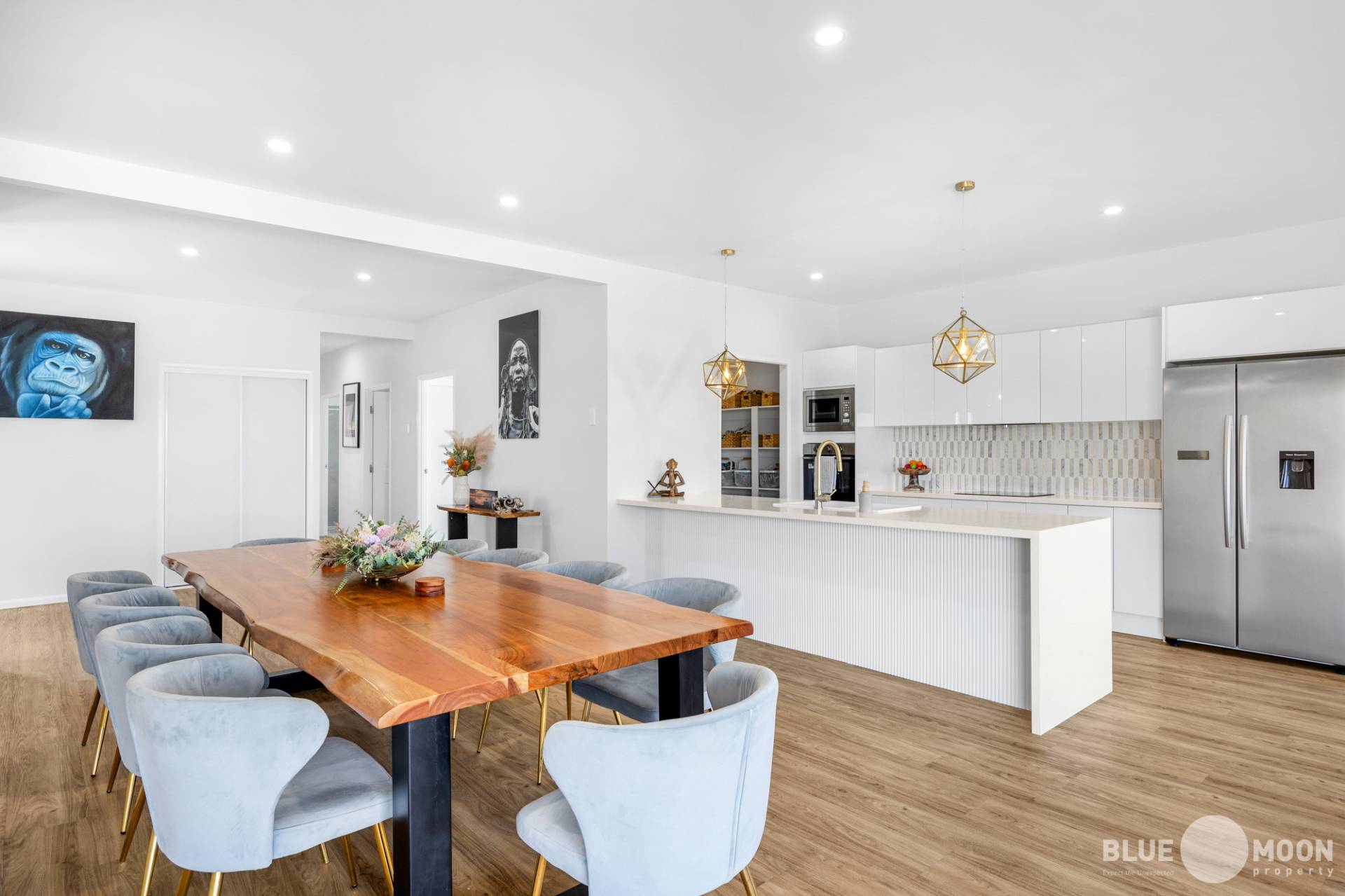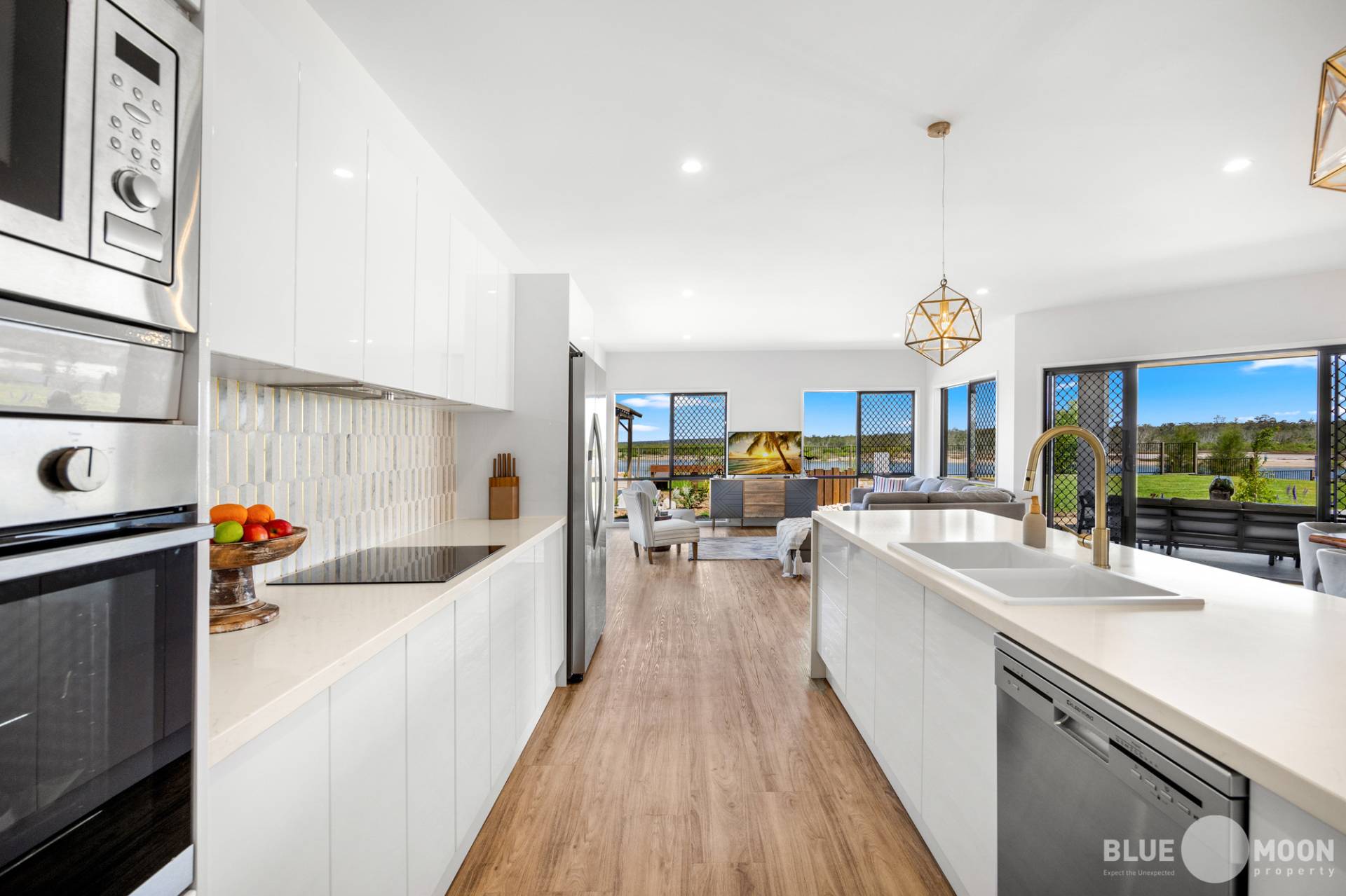 The stunning designer kitchen, with magnificent water views, has been finished in crisp white cabinetry with an eye catching feature splashback . Boasting quality appliances, stone benchtops with waterfall edge, electric cooktop, dishwasher and walk in pantry this space is a masterclass in functional and elegant design. The two beautiful feature pendant lights that hang above the island bench add to the properties unique coastal design elements.