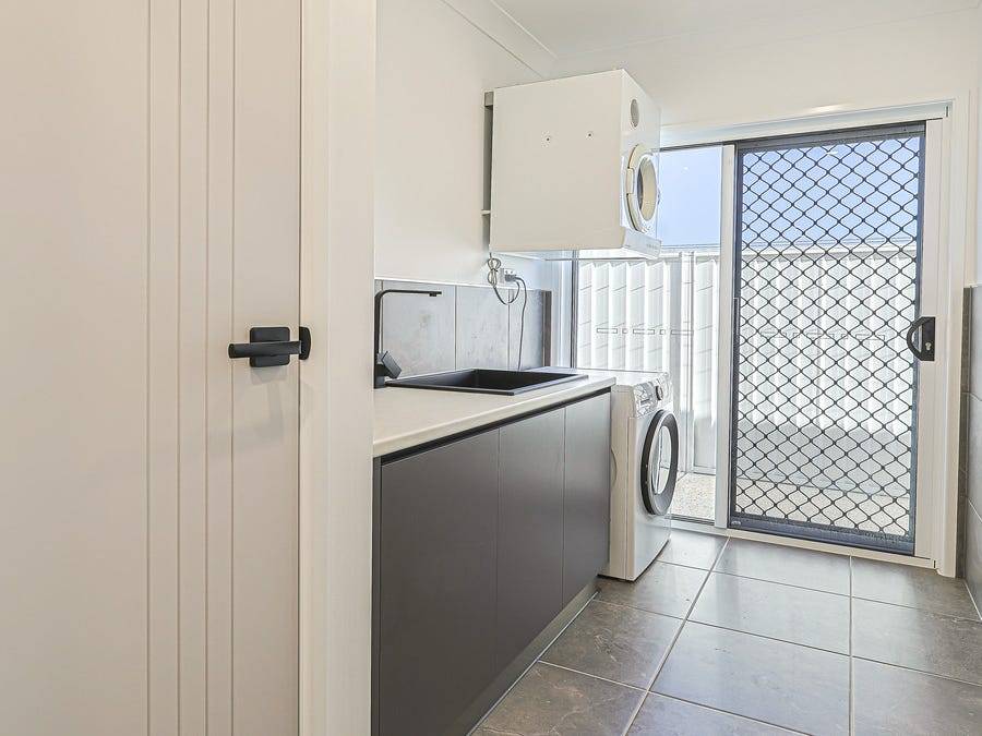 -Stylish laundry with built in cupboard space together with a convenient bench top