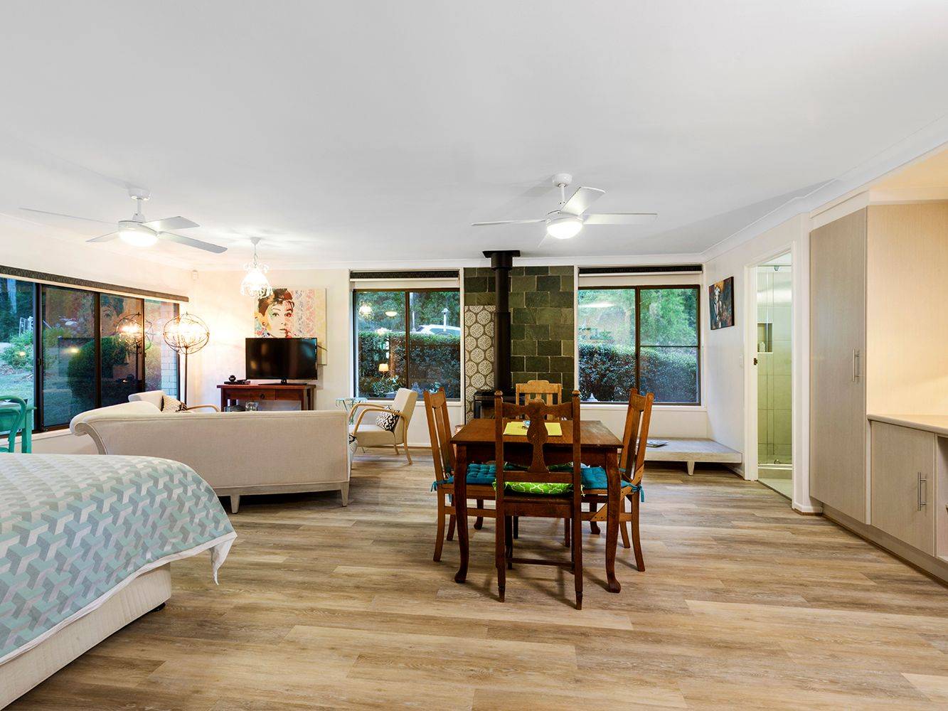 Presenting many options is the spacious self contained studio featuring cosy fireplace, with new kitchenette and bathroom. Currently operating as a successful Air B&B the options here are endless with dual living / income / luxurious master suite or extra living options. Whatever you decide, this is a stunning space. There are three further spacious bedrooms with generous storage.
